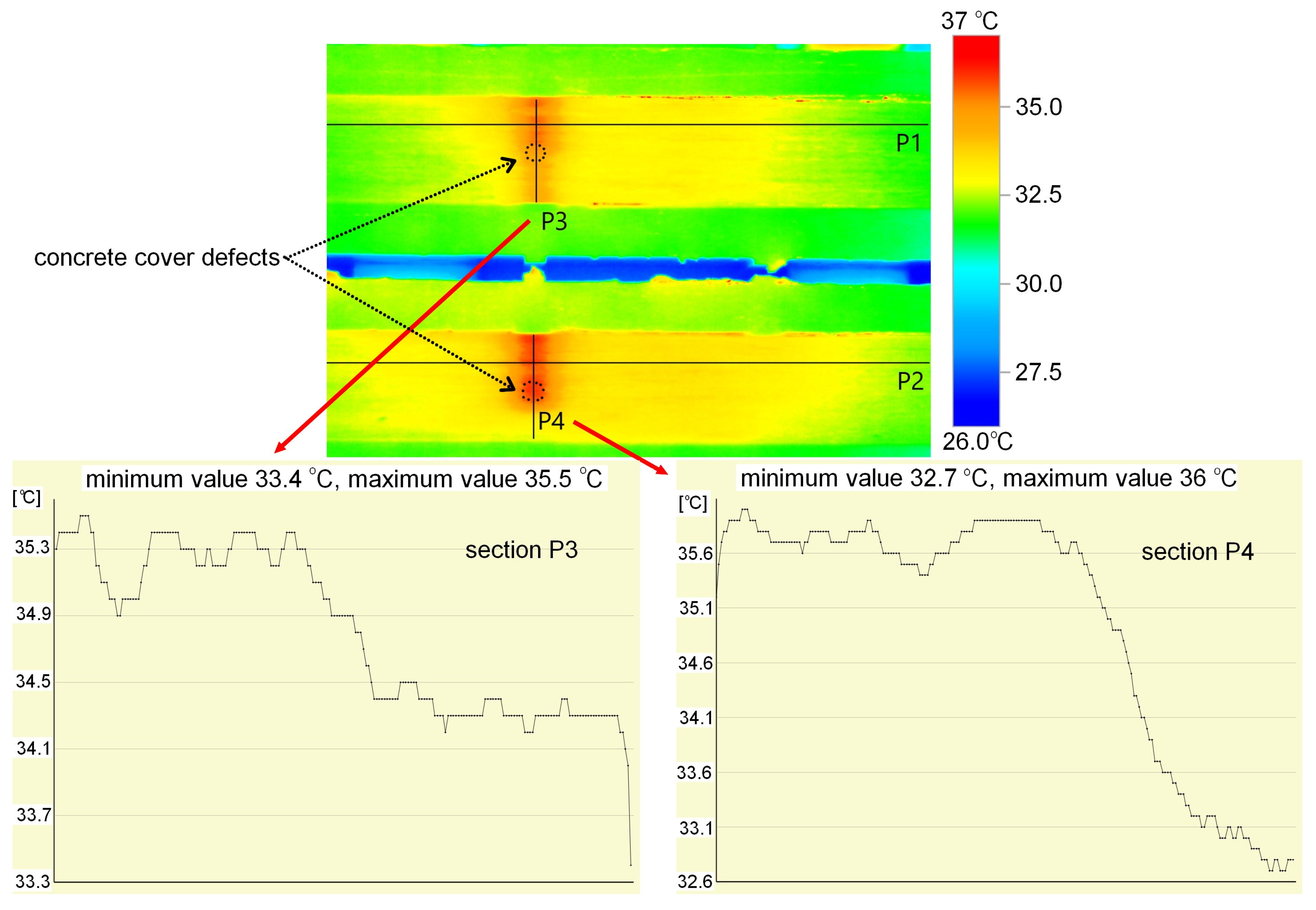 - Infrared thermography (IRT), or more precisely, active thermography, which involves applying an independent heat source, a thermal effect, to the examined area, allows the detection and location of defects in externally bonded FRP concrete structures. This applies to both bond defects (voids) in the adhesive layer and concrete defects in the form of voids in the concrete cover. In these areas, the temperature is not transferred to the concrete, so it is higher than in the remaining area. However, it should be remembered that, after the heat source, the surface temperature of the CFRP strip uniforms very quickly. This method allows for a rough assessment of the defect size. Distinguishing between voids in the adhesive layer and voids in the concrete cover is possible, but the results are not always clear. In the case of overlapping defects, the differences in measured temperatures were very small, 0.2–0.3 °C, with a maximum measured temperature of 36.5 °C, a difference of approximately 0.68%. Therefore, detecting such a small difference in the real conditions at the site may be difficult or almost impossible. The method allowed the identification of shallow and medium-depth defects (ΔT ≈ 2–3 °C) with high confidence (ΔT ≫Utotal). However, for deep or small defects, the thermal contrast approached the measurement uncertainty (ΔT ≈ 0.3–0.5 °C), making detection less reliable. These limitations are intrinsic to the thermal diffusion process rather than the camera performance. However, the method offers rapid, contactless inspection and complements ultrasonic and acoustic techniques in comparative diagnostics.