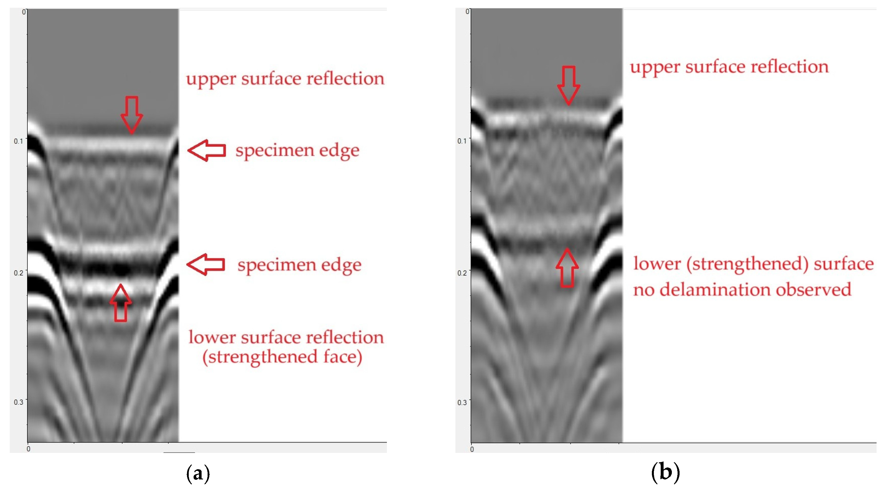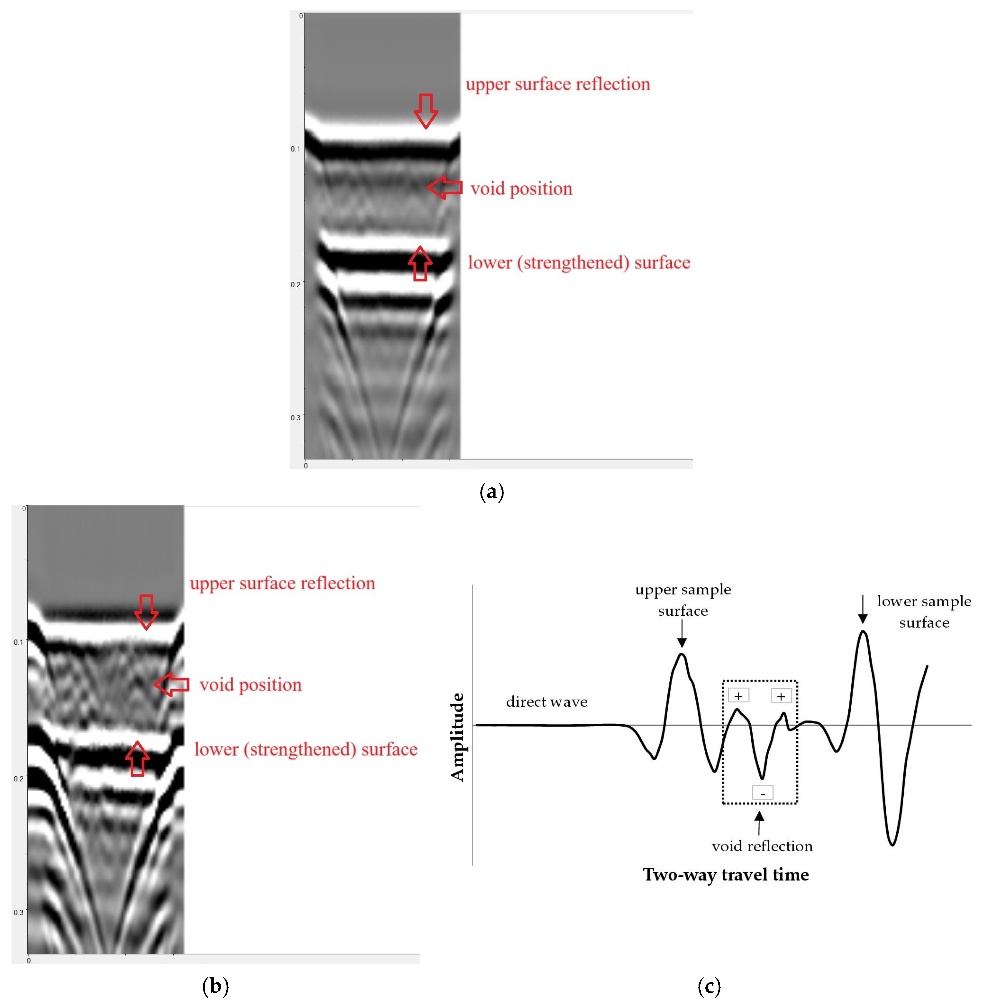 - GPR can be used to detect defects in concrete with externally bonded CFRP strips, but its scope is limited. The 2 GHz antenna allowed for the easy detection of voids in concrete, but imaging delamination at the strip–concrete interface was not possible due to insufficient system resolution and signal overlap with strip reflection. The amplitude decrease observed at the debonding site was very small (approximately 5%). In practical applications, this difference may be insufficient to clearly identify debonding locations. However, the most significant limitation of GPR inspection is the electrical conductivity of CFRP strips, which practically prevents GPR measurements being conducted on their surface. Scanning from the opposite (unreinforced) side, although efficient as indicated in this study, is often impossible in practice because of limited access.