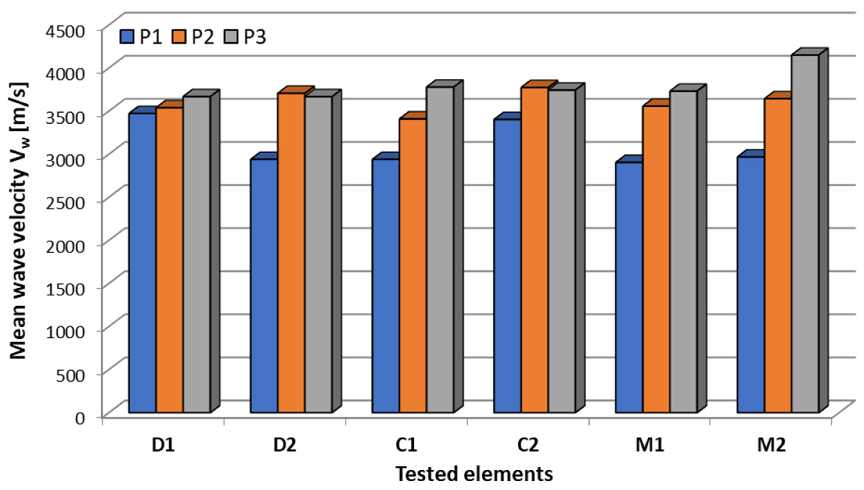 - The results obtained from elastic wave velocity measurements using the Hsu-Nielsen reference source allowed the following conclusions: the method was confirmed to be effective in detecting defects in concrete with the bonded CFRP strip. A decrease in elastic wave velocity was observed in damaged areas compared to areas without defects, averaging 10 to 20%; the magnitude of the difference in elastic wave velocity depends on the size and location of the defect. In the case of local debonding of the CFRP strip (sample D1), a 2% decrease in velocity was observed; a more dense distribution of measurement points is necessary to minimise the risk of underestimation; the velocity values of the Vwof waves passing only through concrete were consistent (3650–3750 m/s), confirming the homogeneity of the material, with the exception of one sample (M2), where the improved concrete compaction may have influenced the observed wave velocity; the type of defect did not significantly affect the recorded wave velocity values. Both adhesive layer defects and concrete cover defects generated comparable velocity drops, suggesting that the method is useful for detecting the presence of damage, not its type; the differences in elastic wave velocity in areas without and with defects are clear and measurable, demonstrating the method’s potential in structural diagnostics.