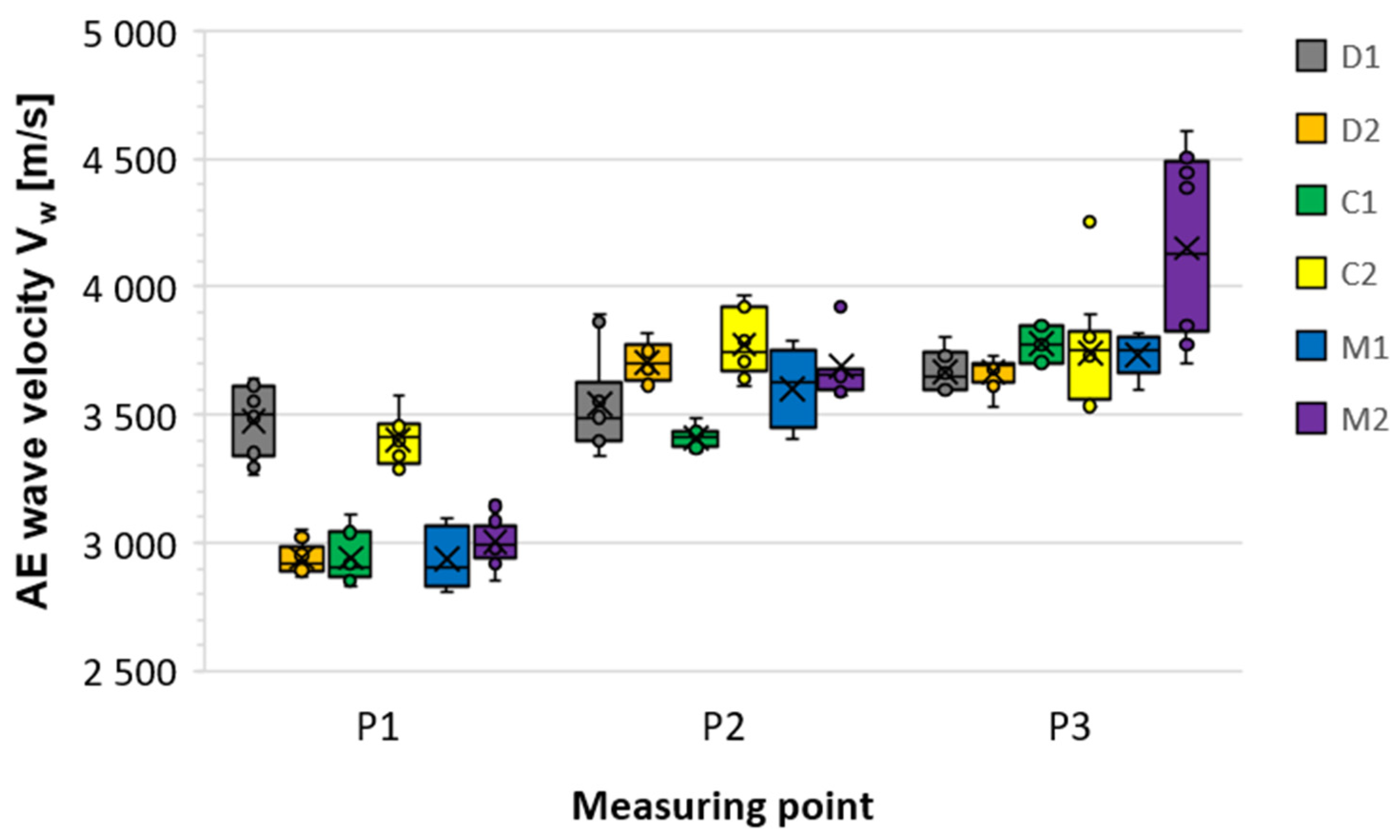 | Test Samples | AE Wave Velocity Vw | Difference in AE Wave Velocity Between Position 2 and 1 | ||||||||||||