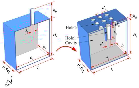 The ENHR is constructed by replacing the neck of HR to an embedded one while keeping other geometric parameters unchanged, as shown in Figure 1, which consists of cylindrical hole 1, with a height of h0 and diameter of di, cylindrical hole 2, with a height of hii and diameter of dii, a square cavity with a side length of ai and bi and depth of Hi, a cell period of mi and li, and so on. The neck diameter of HR is equal to that of hole 1, and the neck height of HR is h0 = hi + hii + Hii. The definition of the absorption area is φi = nπdii2/(4Si), where n represents the number of holes and Si = li∙mi can be defined as the incident area of the cell.
