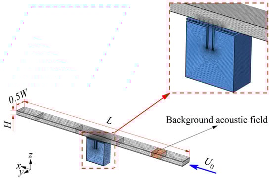The flow–acoustic coupling aerodynamic simulation is performed to explore the physical mechanism of ENHR controlling the low-frequency aerodynamic noise based on computational fluid dynamics (CFD) and acoustics. First, a CFD model is established to solve the flow characteristics and the variables such as flow pressure, velocity, and dynamic viscosity can be calculated. As shown in Figure 2, ENHR elements are located along the longitudinal centerline on the underside of the duct, and the length L, width W, and height H of the duct are 1300 mm, 45 mm, and 10 mm, respectively. The airflow with Ma of 0.05 flows downstream from the x axis; the Reynolds number calculated based on the Ma and length (L) of duct is 1.49 × 106, indicating that this flow is in a turbulent state. The k-ε turbulence model is employed to analyze the flow characteristics inside the duct, while the wall function is used to describe the flow characteristics near the wall and inside the structure. The front and rear surface of the computational domain are set as the velocity inlet boundary and pressure outlet boundary, the symmetrical surface is set as the symmetric boundary, and the remaining surfaces are set as no-slip boundaries. The CFD mesh division of the entire computing domain mainly adopts hexahedron and tetrahedron with a total number of 788,315. Six boundary layers with a thickness of 0.02 mm for the first layer and each layer increasing at a ratio of 1:1.2 are arranged in the near-wall area, and a smoothing algorithm is used to minimize the gradients of the mesh size. The verification of this aerodynamic simulation method has been accomplished in our previous studies through mesh convergence studies, as well as comparative analyses with the experimental results of Leinhart et al. [,,,]. Then, the solved flow variables are mapped to the acoustic model according to the equation of (where Xaci and Xi represent mapped variables and flow variables, i is the number of coupled variables, α is the diffusion constant, and hm is the mesh size) and the mapped pressure and velocity can be calculated, the accuracy of the mapped study can be verified by comparing the turbulent viscosity and axial velocity vector, respectively, calculated by the flow mesh and acoustic mesh []. Finally, the coupling of the flow and acoustics is achieved by establishing an acoustic model using linearized Navier–Stokes equations and mapped variables as inputs to solve the acoustic variables. The plane sound wave passes along the x axis and is set as a background acoustic feature to a small domain. The background acoustic variables can be defined as , , and , in which Ub, Pb, and Tb, respectively, represent the background acoustic velocity along the x axis, pressure, and temperature, k0 is the wave number, cω is the speed of sound, ω is the angular frequency, ρω is the density of air, T0 is the equilibrium temperature, αP is the thermal expansion coefficient, and Cp is the heat capacity under constant pressure []. In our previous work, the verification of the flow–acoustic coupling simulation of the ducted silencer system for the TL at Mach numbers of 0, 0.05, and 0.1 similar to that of the research by Lienhart et al., was conducted [,]. The results show that the peak of TL significantly decreases and shifts to higher frequencies as the Mach number of the fluid flow increases from 0 to 0.1. That is, the fluid flow weakens the attenuation effect of HR on the acoustic field, and this flow–acoustic coupling model can capture well the attenuation process when the acoustic field interacts with turbulence. The simulated TL at different Mach numbers [] are almost consistent with the test results in reference [], which further proves that the flow–acoustic coupling model could achieve efficient and accurate simulation of acoustic properties under the influence of fluid flow.