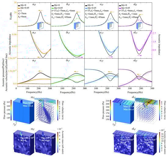 In Figure 3, the flow and acoustic characteristics of ENHR and HR under the incident fluid flow of Ma = 0 and Ma = 0.05 are, respectively, simulated. As shown in Figure 3(a0,a1), the parameters of HR are a1 = 45 mm, b1 = 45 mm, l1 = 47 mm, m1 = 47 mm, H1 = 49 mm, d1 = 5 mm, and h0 = 8 mm; the amplitude of TL of the HR when Ma is 0.05 decreases by 10.9 dB from 20.9 dB to 10.0 dB compared with that of Ma = 0; the peak of acoustic impedance increases by 0.01 from 0.002 to 0.012; and the frequency of the peak shifts by 26 Hz from 208 Hz to a higher 234 Hz. In Figure 3(a2), as Ma increases from 0 to 0.05, a significant decrease in the normal acoustic velocity and little change in the acoustic pressure of HR are the key causes of the great reduction in TL and rapid increase in impedance peak. In Figure 3(a3), when fluid with an Ma of 0.05 flows, there is a counterclockwise pressure difference of 26.2 Pa between the maximum pressure (167.8 Pa) and the minimum pressure (141.6 Pa) at the HR interface, resulting in the counterclockwise shear stress and vortex inside the neck; thus, the formation of a slip velocity consistent with the main flow direction at HR interface occurs []. Under the effect of the slip effect, the TL decreases and acoustic impedance increases due to the diminished acoustic attenuation resulting from reduced communication between the main flow and HR. The main flow to the inside of HR is weakened, and the normal acoustic velocity of HR decreases, causing a reduction in the effective length of the HR neck observed as shift in the impedance peak to a higher frequency. According to Figure 3(a4), the acoustic mass of HR corresponding to the peak frequency of 208 Hz is 6.13 × 10−4 when Ma is 0, while the acoustic mass corresponding to 234 Hz with an Ma of 0.05 is 2.75 × 10−4; the decrease in the acoustic mass of HR with the increase in main flow velocity is the direct cause of the shift in the impedance peak to higher frequencies.