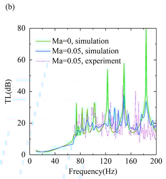 Figure 5 shows the broadband control of low-frequency aerodynamic noise of the ducted silencer system with an ENHR metasurface containing three groups of basic unit arrays when the Ma is 0 and 0.05, respectively. To validate the results of the theoretical and simulation analysis, ENHR samples are made of photosensitive resin by additive manufacturing, and wind tunnel experiments are conducted as shown in Figure 5a. The airflow during the experiment is maintained consistent with that in simulation at a Ma of 0.05, which is supplied by four nitrogen gas cylinders and could reach a maximum velocity of 20 m/s. The acoustic pressures at the positions of 1, 2, 3, and 4 are measured sequentially using the BK 3050 multi-channel data acquisition instrument and MPA416 1/4-inch microphone, and three repetitive tests are performed for each measuring position to eliminate random errors during the data acquisition. Figure 5b shows the TL of the ducted silencer system with the ENHR metasurface through simulations and experiments when the Ma is, respectively, 0 and 0.05, and a continuous reduction in aerodynamic noise by 18.7 dB in the range of 70~200 Hz is achieved. The measured TL values in the experiment are generally smaller and show the same trend compared to that of the simulated values within the entire frequency range, and the average errors between the simulations and experiments are no more than 5%. These errors can firstly be attributed to the assumption in the simulation that the sound waves propagate in the duct and resonators in the form of plane waves, resulting in the system response presenting a single resonance peak and a smooth TL curve. A series of peaks and valleys appear in the TL curves under coupling and the interference of the fundamental mode and higher-order modes during the experiment, causing significant differences between the peaks of simulations and experiments. Secondly, the rigid assumption for the duct and resonators in the simulation and the occurrence of acoustic–solid coupling in the experiment will result in additional differences in resonance peaks and valleys in the TL curves. The superposition of the TL and random excitation generated by the coupling of sound and vortexes in the experiment and the assumption of uniform flow in the simulation would then lead to larger errors. Furthermore, the ineffectiveness of resonators in noise reduction caused by processing defects such as blockages and the inaccuracy in the control of flow velocity are also important factors for the deviation in simulations and experiments. Finally, the simulations and experiments have demonstrated well the reliability of the simulation method in this study and the effective aerodynamic noise reduction in ENHR metasurfaces ranging from 70 Hz to 200 Hz with a Mach number of 0.05.
