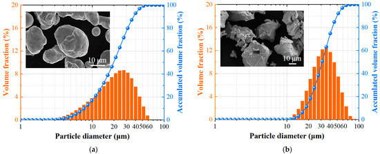 Particle size distribution and morphological characteristics of feedstock powders for copper–titanium composites: (a) copper powder, showing a near-spherical morphology; (b) titanium powder, exhibiting an irregular, angular morphology.