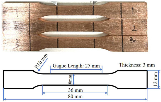 Geometry and dimensions of the tensile specimen, extracted perpendicular to the deposition direction from cold-sprayed Cu-Ti composites. The numbers 1, 2, and 3 marked on the specimen denote the three parallel samples.