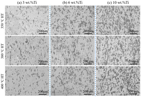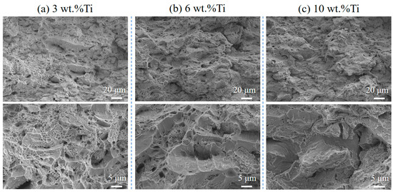 Figure 11 compares the fracture surfaces of composites with 3, 6, and 10 wt.% Ti after 400 °C heat treatment. Although all samples exhibit dimpled fracture, the size and density of dimples decrease with increasing Ti content. This trend is consistent with the reduction in elongation presented in Figure 8b, where higher Ti contents led to lower ductility.