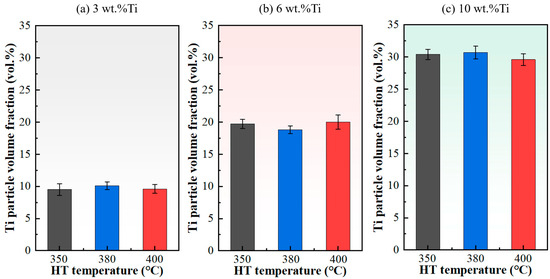 The volume fractions of Ti particles in the composites, corresponding to the different initial Ti contents in the powders, were quantitatively analyzed, and the results are summarized in Figure 4. The measured Ti volume fraction is approximately 10% in the sample prepared with 3 wt.% Ti powder, 20% for the 6 wt.% Ti condition, and reaches about 30% for the 10 wt.% Ti sample. The heat treatment temperature, within the range of 350–400 °C, exhibits no notable effect on the retained Ti content within the coatings.