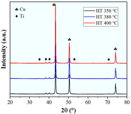 XRD patterns of the cold-sprayed Cu-10 wt.% Ti composite after heat treatment at 350 °C, 380 °C, and 400 °C.