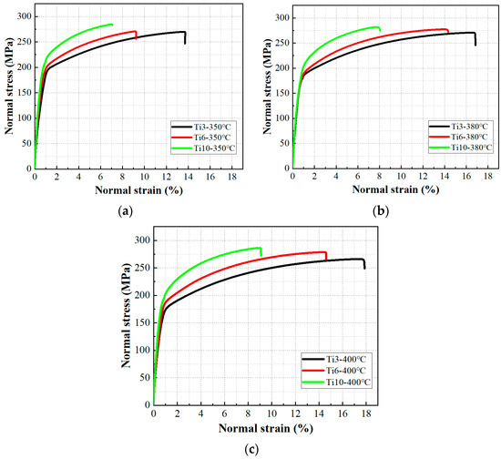 The tensile performance of the cold-sprayed Cu-Ti composites was systematically evaluated to understand the effects of titanium content and heat treatment temperature. Representative engineering stress-strain curves are presented in Figure 7, revealing consistent ductile fracture behavior across all samples. Each curve displays a linear elastic region followed by a plastic strain-hardening stage, indicative of dislocation-mediated deformation in the copper matrix. The absence of an abrupt fracture confirms the lack of brittle intermetallic phases, as supported by XRD analysis.