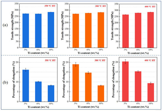 In contrast to the strength behavior, elongation exhibited strong dependence on both parameters, as clearly demonstrated in Figure 8b. The Ti content has a strong and consistent impact on the ductility of the composites, and the difference in elongation between composites with different Ti contents becomes more obvious as the heat treatment temperature increases. At 350 °C, elongation decreases dramatically with increasing Ti content: from 16.0% for Ti3 to 10.0% for Ti6, and further to 8.3% for Ti10, corresponding to a 48.1% reduction from the lowest to the highest Ti content. This trend persists at elevated temperatures, with absolute values increasing due to thermal recovery effects but maintaining the same hierarchical order. At 400 °C, the Ti3 composite achieves exceptional ductility (20.3%), while Ti6 and Ti10 reach 15.3% and 9.3%, respectively—still reflecting a 54.2% reduction across the Ti content range.