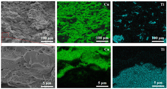 EDS elemental mapping of the fracture surface of the cold-sprayed Cu–Ti composite, revealing the distribution of Cu and Ti.
