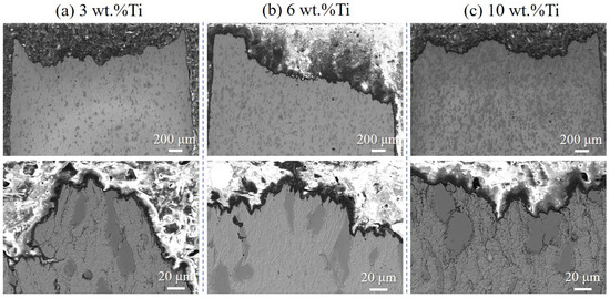 Furthermore, high-magnification examinations of the regions adjacent to the fracture path did not reveal clear microstructural evidence of new phase formation. While this observation does not preclude the possibility of subtle interfacial changes, it supports the interpretation that the embrittling effect of Ti addition is primarily a consequence of mechanical constraint.