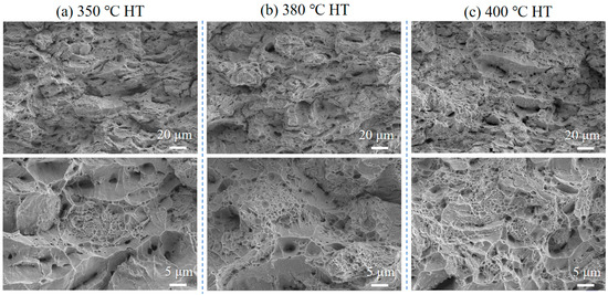 Figure 13 shows fracture surfaces of the Cu-3 wt.% Ti composite after heat treatment at 350 °C, 380 °C, and 400 °C. With increasing temperature, the dimples become larger and more numerous, reflecting enhanced plastic deformation capacity. This correlates with the improved elongation values reported in Section 3.2, where higher heat treatment temperatures led to greater ductility recovery.
