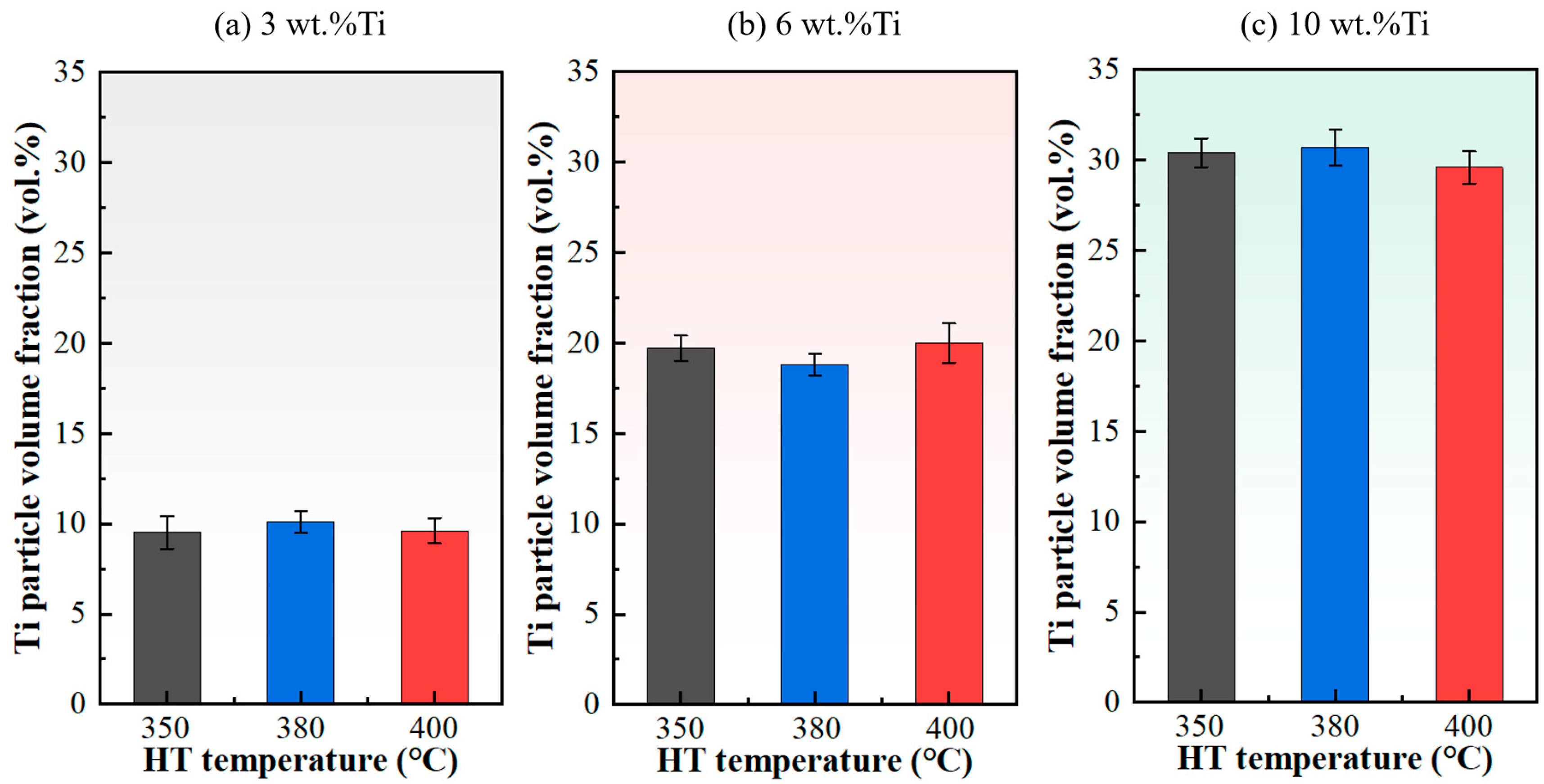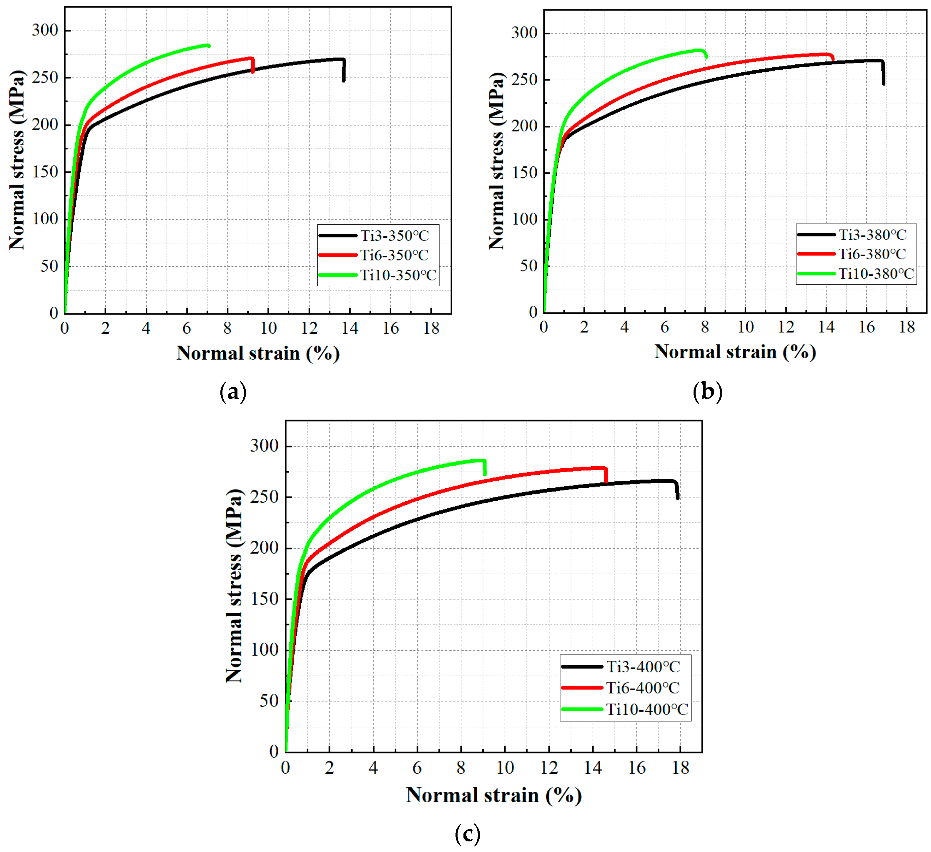 - Heat treatment within the range of 350–400 °C not only enhanced ductility through recovery and stress relief in the copper matrix—particularly in low-Ti composites—but also contributed to a moderate improvement in strength. The ultimate tensile strength exhibited a slight but consistent increase with higher treatment temperatures across all Ti contents. The optimum combination of strength and ductility was achieved in the 3 wt.% Ti composite after 400 °C treatment.