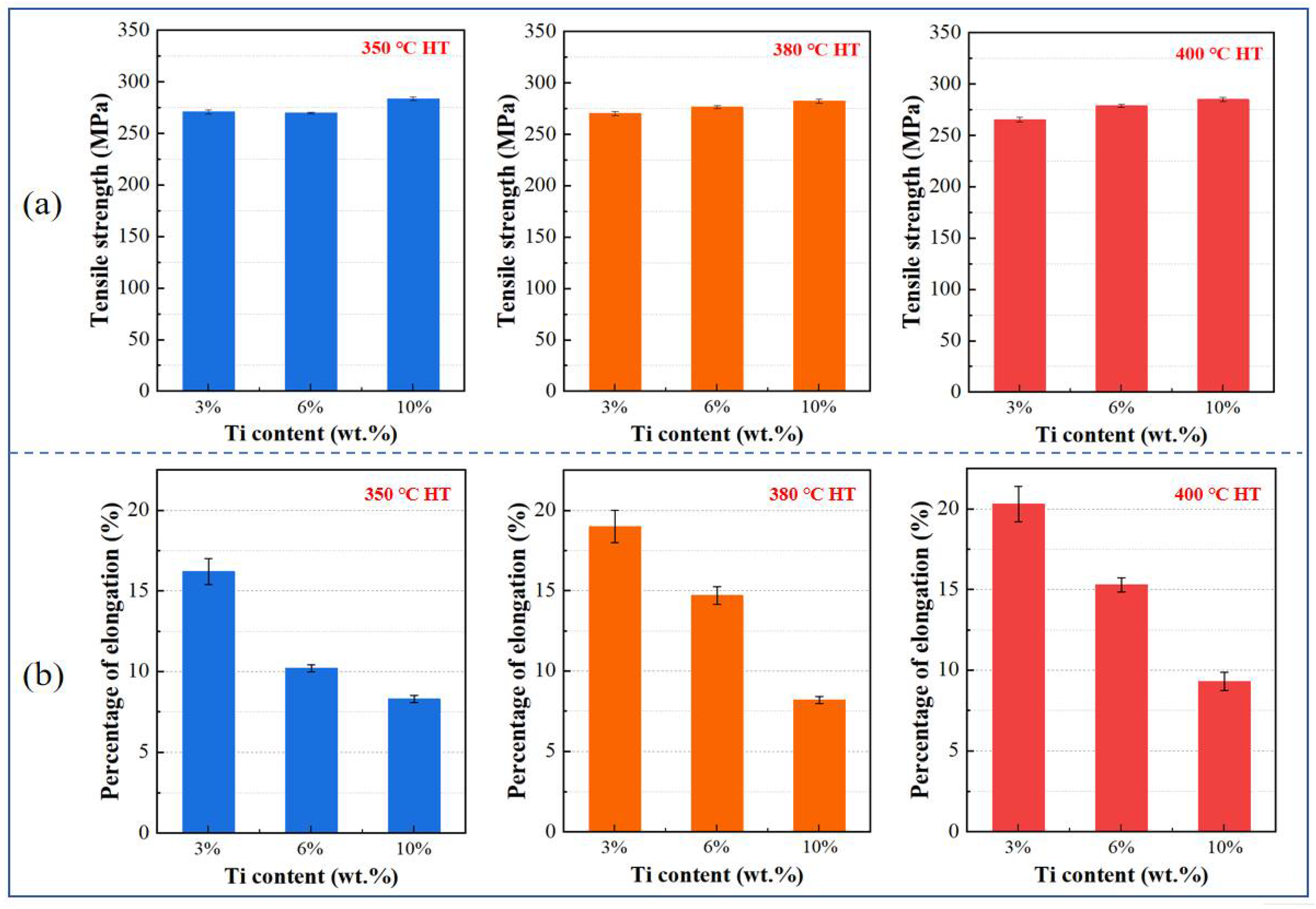 - The ultimate tensile strength (UTS) showed limited sensitivity to Ti content, remaining in the range of 265–285 MPa across all conditions. This suggests that strength is dominated by the Cu matrix and interfacial mechanical bonding rather than Ti reinforcement. Ductility was significantly influenced by Ti content, with elongation decreasing from 20.3% (3 wt.% Ti) to 9.3% (10 wt.% Ti) after 400 °C treatment. This reduction is attributed to the constraint effect of Ti particles on dislocation motion and plastic flow in the Cu matrix.