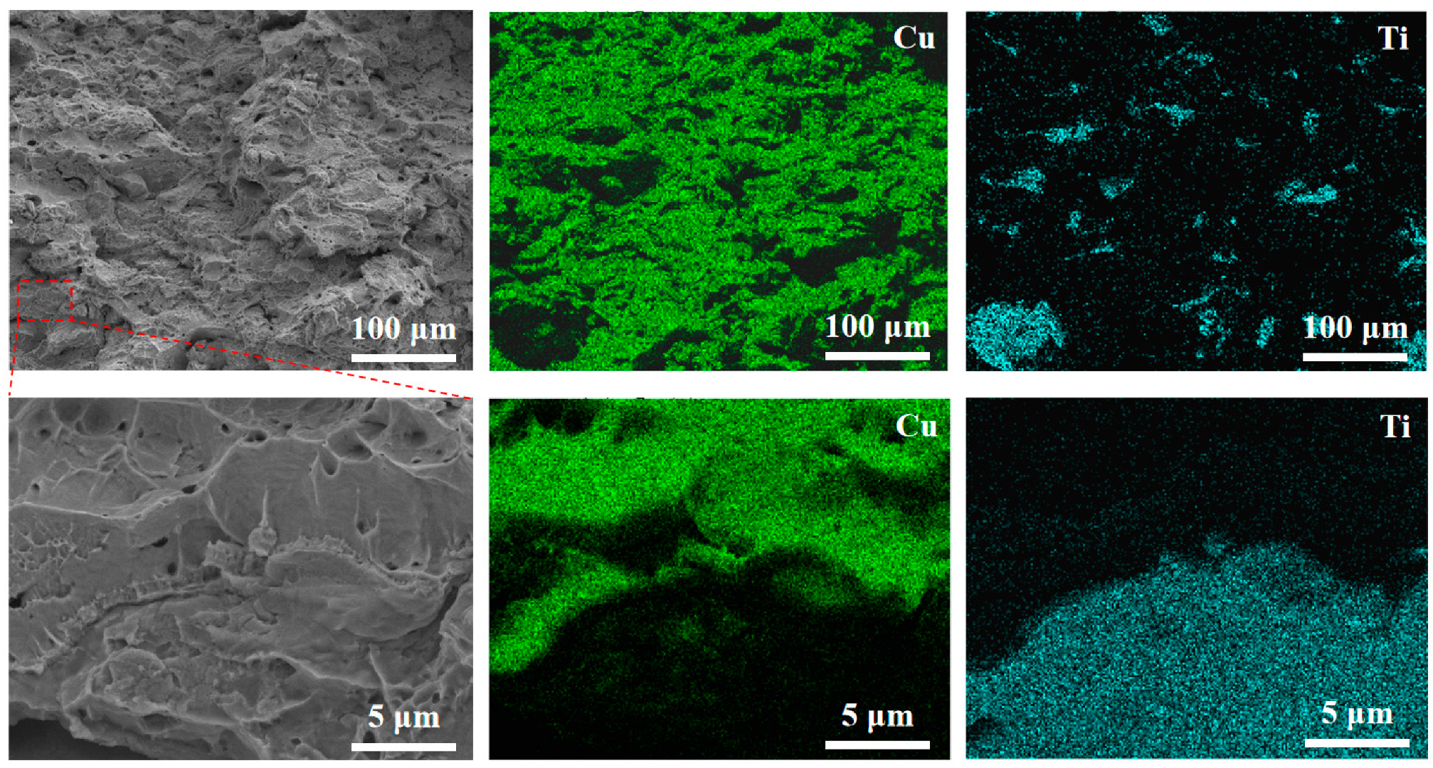 - Dense and defect-free Cu-Ti composites were successfully fabricated by cold spraying, with Ti particles uniformly dispersed in the copper matrix. The absence of intermetallic compounds and oxides confirms that the CSAM process facilitates solid-state deposition without undesirable phase reactions. Fractographic examination revealed a ductile fracture mode across all composites, characterized by dimpled surfaces and absence of interfacial debonding, demonstrating strong mechanical stability and interfacial integrity of the Cu–Ti interfaces.