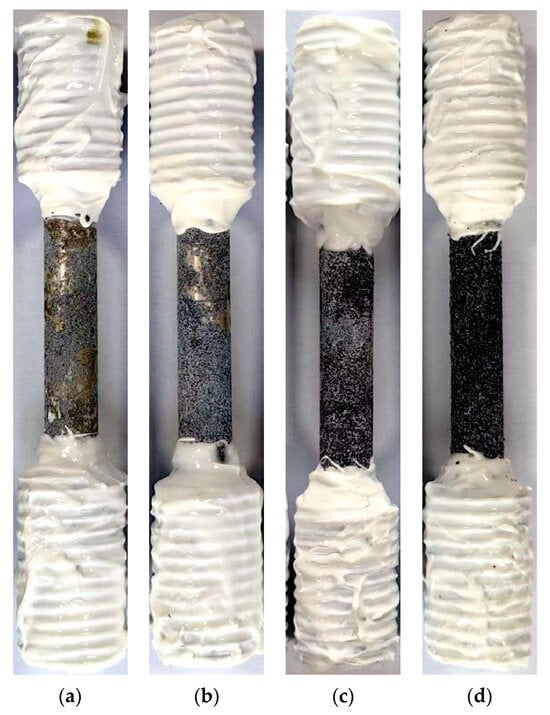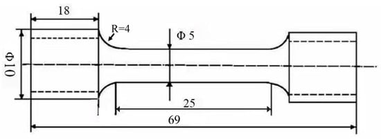 Tensile tests were performed on an AG-100kNG universal testing machine (Shimadzu Co. Ltd., Tokyo, Japan) with a crosshead speed maintained at 1 mm·min −1. Dog-bone-shaped samples were machined following the GBT 228.1-2021 standard [], the detailed dimensions were provided in Figure 1. To evaluate the mechanical degradation, specimens were immersed in Hank’s solution for 1, 3, 5 and 7 days (denoted as 1 d, 3 d, 5 d, and 7 d in the figures, respectively) before testing, using a non-pre-immersed sample as the control. During immersion, the clamping sections of the specimens were sealed with silicone rubber to avoid corrosion. After tensile failure, the fractured surface was examined using SEM. Each testing condition was replicated at least three times to ensure reproducibility.