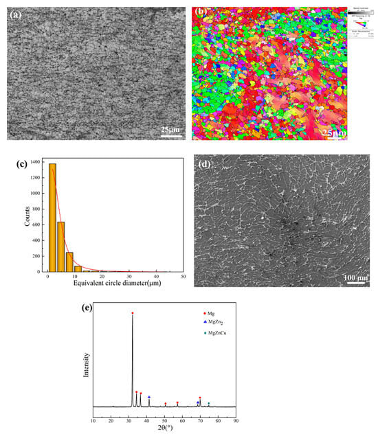 Microstructure of as-extruded Mg-6Zn-0.5Cu alloy characterized by (a) OM and (b) EBSD, (c) the distribution of grain size, (d) SEM image and (e) XRD pattern.