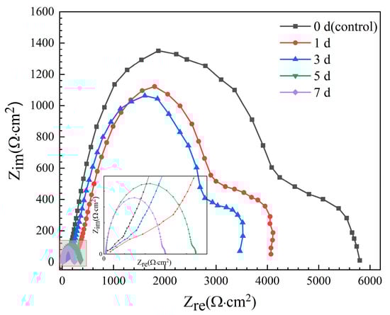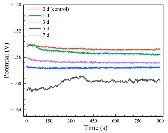 The open circuit potential (OCP) curves of the Mg-6Zn-0.5Cu alloy after different immersion durations are presented in Figure 3. All curves exhibit relatively stable potentials with minor fluctuations, which can be attributed to the dynamic formation and detachment of corrosion products [,]. The electrochemical activity, ranked as 7 days > 5 days > 3 days > 1 day > 0 day (control), increases with immersion duration. The sample immersed for 7 days exhibits the most negative OCP value, indicating the highest susceptibility to corrosion. While the non-pre-immersed control, with the noblest potential, demonstrates the lowest tendency. This trend suggests that prolonged immersion duration enhances the electrochemical activity of the alloy, which may be due to changes in its surface state.