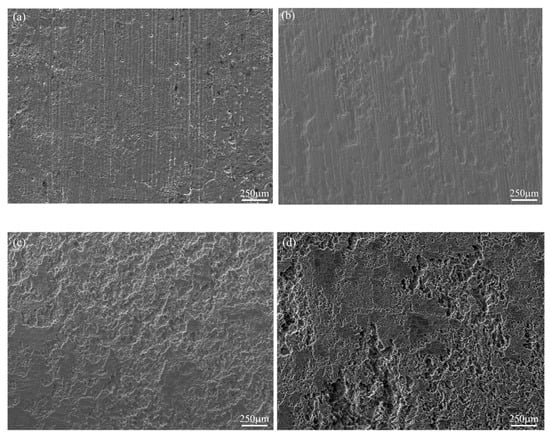 Corrosion morphologies of the Mg-6Zn-0.5Cu alloy under different immersion durations in Hank’s solution, characterized by SEM at 50× magnification. (a) 1 day, (b) 3 days, (c) 5 days and (d) 7 days, respectively.