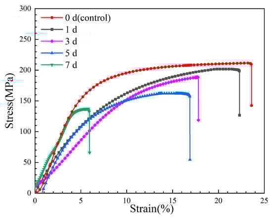Stress–strain curves of the Mg-6Zn-0.5Cu alloy under varying immersion durations in Hank’s solution.
