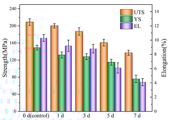 Figure 8 shows the stress–strain curves of the Mg-6Zn-0.5Cu alloy after varying immersion durations, and the red curve represents the original mechanical properties of the tested alloy. The corresponding mechanical properties of the alloy after 1, 3, 5 and 7 days immersion are plotted in Figure 9. For the non-pre-immersion sample, the ultimate tensile strength (UTS), yield strength (YS) and elongation (EL) are 209 MPa, 149 MPa and 10.3%, respectively. As the immersion time increases, the UTS, YS and EL of the alloy progressively decrease. After 7 days’ immersion in Hank’s solution, the UTS, YS and EL of the alloy decrease to 137 MPa, 76 MPa and 4.1%, corresponding to reductions of 34.4%, 48.9% and 60.1%, respectively, compared to the non-pre-immersed alloy.