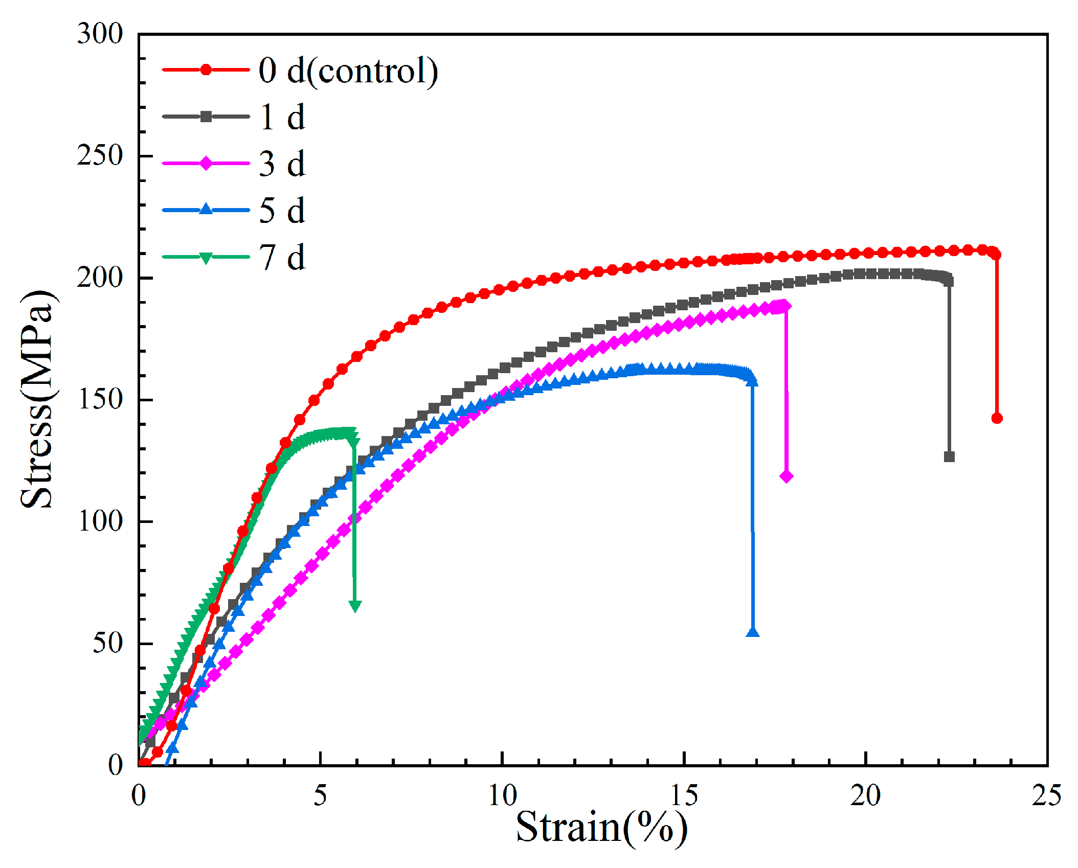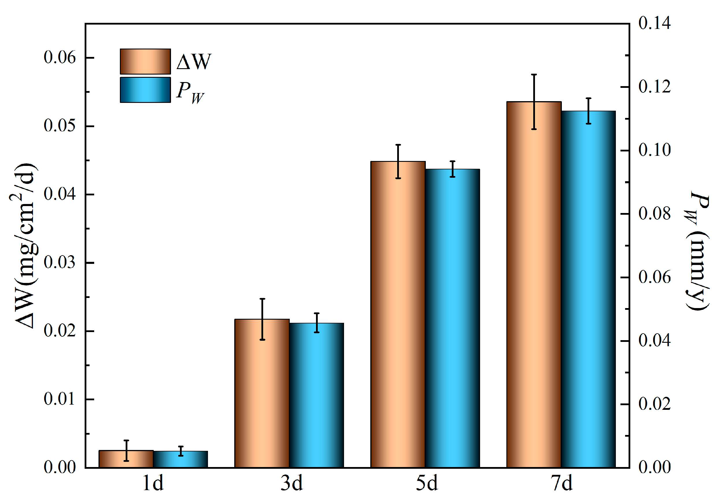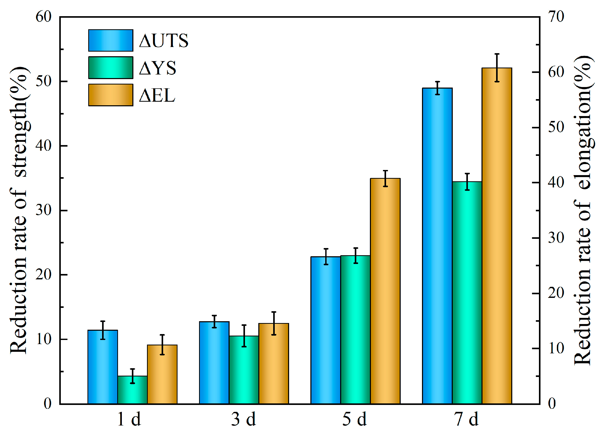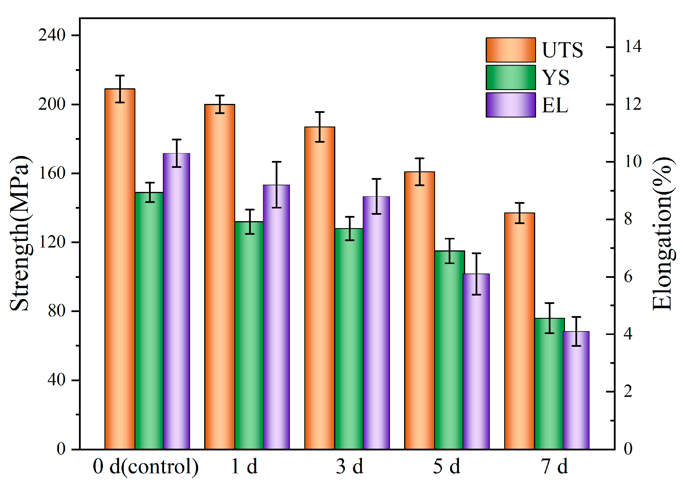 - After 7 days’ immersion, the UTS and EL decreased markedly by 34.4% and 60.1%, respectively. While the weight loss of 0.054 mg∙cm−2∙d corresponds to a degradation rate of 0.11 mm/y.