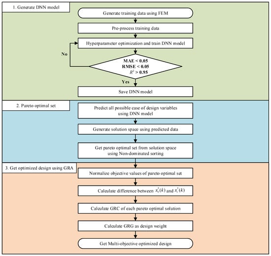 First, to train the DNN surrogate model, a set of simulation data is generated using finite element analysis (Generate training data using FEA). The number of samples was determined based on the complexities and dimensions of the design variables. The FEA results were then normalized to a range between zero and one to enhance the learning performance of the DNN (Preprocessing the training data). Hyperparameter tuning was performed to determine the optimal DNN architecture (Hyperparameter optimization and training of the DNN model). The model with the best predictive performance on the validation set was saved for subsequent analysis (Save DNN model).