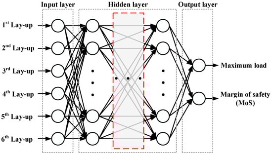 The ReLU function outputs zero for negative inputs and a linear response for positive inputs, thereby accelerating the training process and alleviating the vanishing gradient problem. In this study, the DNN was trained using an adaptive moment estimation (Adam) optimizer, which has demonstrated robust performance in navigating parameter spaces and has been widely adopted for DNN training tasks []. A schematic of the constructed deep neural network architecture is shown in Figure 2. The model comprises an input layer, several hidden layers, and two output nodes corresponding to the maximum load and margin of safety (MoS). ReLU activation was applied to each hidden layer, and the Adam optimizer was used for model training. Early stopping was implemented to prevent overfitting during the training. To assess the prediction accuracy of the trained model, three standard evaluation criteria were used: the Mean Absolute Error (MAE), Root Mean Square Error (RMSE), and coefficient of determination (R2). The definitions of these metrics are