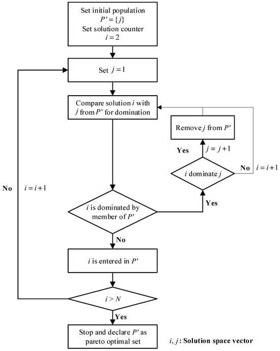A solution is considered non-dominated if no other solution in the feasible space satisfies both of these conditions. All non-dominated solutions collectively form the Pareto optimal set, which characterizes the boundary of the achievable trade-offs. The process of identifying the Pareto optimal set through non-dominated sorting is illustrated in Figure 4. In this process, the candidate solution j from the solution space is compared with every other solution i. If i dominates j, then j is removed from the candidate set P’. If j is not dominated by any solution i, it remains in P’. This iterative comparison is performed for all i ∈ {1, 2, …, N}, where N is the total number of feasible solutions. The final set P’ after completing all comparisons constitutes the Pareto optimal set.