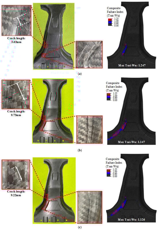 The crack propagation behavior at a punch stroke of 18 mm is shown in Figure 15. As illustrated in Figure 15a,c, Cases 1 and 3 exhibited similar crack locations and propagation patterns in both the simulation and experiments. However, Case 3, which was optimized to minimize the failure index, exhibited fewer cracks and lower predicted damage. The close agreement between the simulated crack locations and those observed experimentally further confirms the validity of employing the Tsai-Wu index as an effective criterion for damage initiation. In contrast, Figure 15b shows that Case 2 experienced a more concentrated crack zone. The Tsai-Wu failure index reached 1.247, which was the highest among all the cases, indicating stress concentration and early failure. This behavior is consistent with the early onset of cracking, as discussed above, confirming that Case 2 was the most vulnerable in terms of failure safety. These results clearly reveal the inherent trade-off between maximizing the structural strength (Case 2) and enhancing the failure safety (Case 3). The proposed DNN-GRA optimization framework explicitly captures this trade-off and provides a systematic basis for designers to select the most appropriate balance based on their priorities.