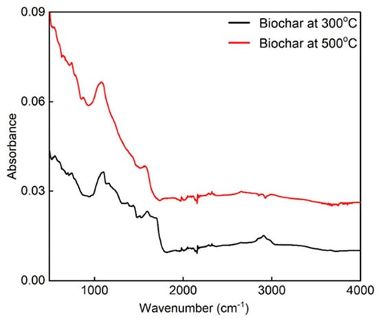 Fourier-transform infrared (FTIR) absorption spectra of the BC at 300 °C and 500 °C.