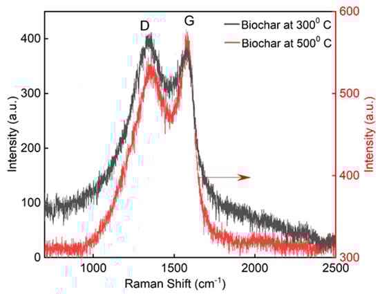Figure 5 illustrates the Raman spectra of BC produced at 300 °C and 500 °C. Both BC samples exhibited the two characteristic peaks at 1352.7 cm−1 (D-bands) and 1579 cm−1 (G-bands). The D peak indicates the presence of defects and disordered structures within the carbon matrix, and the G band is associated with the vibrations of sp2-hybridized carbon atoms in graphitic carbon layers []. The ratio between D and G peaks (ID/IG) indicates the degree of graphitization of the BC. The sample pyrolyzed at 500 °C showed a relatively lower ID/IG ratio (0.85) compared to that at 300 °C (1.08), indicating a reduction in structural defects and enhanced graphitic ordering at higher temperature. This change in the ratio indicates that graphitization occurs at higher temperatures; additionally, the G band became more intense and narrower, consistent with the development of more ordered sp2 carbon structures [,].