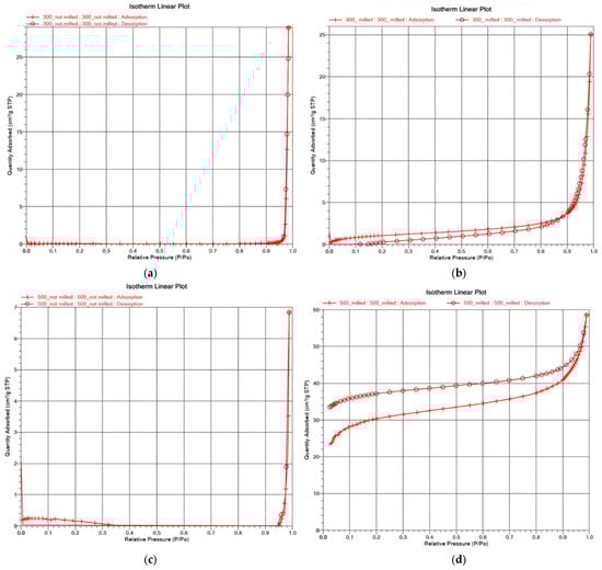 Figure 8 presents the relationship between relative pressure and the quantity adsorbed (cm3/g STP) for BC pyrolyzed at 300 and 500 °C—unmilled and milled. In Table 3, surface area and porosity data are presented. The unmilled 300 °C BC exhibits minimal adsorption within the 0–0.9 P/Po range, indicating negligible micro- (<2 nm) and mesoporosity (2–50 nm). The sharp rise in adsorption at 0.9 P/Po suggests some macroporosity (>50 nm), though the low surface area (0.1467 m2/g) confirms limited pore development and a rough surface. The absence of a hysteresis loop in the nearly identical adsorption/desorption isotherms further supports the lack of micro- and mesopores. While macroporosity is present, the low adsorption capacity highlights limited interaction and overall poor porosity.