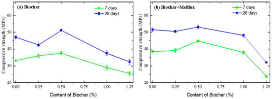 Furthermore, the enhanced graphitic structure observed in BC500 is likely to improve its mechanical stability and chemical inertness when incorporated into cementitious matrices, thereby contributing to the observed increases in compressive strength and durability. The reduced defect density may also influence the surface interactions with hydration products, potentially promoting better particle–matrix bonding and limiting degradation under alkaline conditions. These structural characteristics support the suitability of high-temperature biochar as a functional additive for improving the microstructure and performance of cement-based materials.