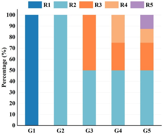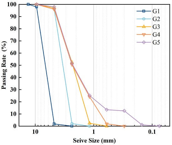As shown in Table 5, 41 vol% of the 4.75–9.5 mm aggregates in the original gradation were replaced by R1 rubber particles (this value was obtained by multiplying the proportion of the 4.75–9.5 mm aggregate in the total gradation, 17.7%, by the calculated aggregate substitution ratio, 7.3 vol%). However, the replacement ratio of aggregate replaced by R3 was up to 80 vol%. For the 0.6–1.18 mm aggregate, due to their low proportion in the gradation, the replacement ratio exceeds 100%. If the rubber particle’s gradation remains unchanged, the aggregates are insufficient for replacement. Therefore, a rubber gradation design method was proposed in this study to address this issue. The percentage of rubber with different sizes in the five gradations (named G1 to G5) was designed as shown in Figure 3. The mix ratio was designed to maintain the total amount of rubber particles at 3% of the total aggregate mass. The 4.75–9.5 mm and 2.36–4.75 mm rubber gradation schemes were consolidated into a new particle size. Based on the single particle size rubber grading scheme of 2.36–4.75 mm, finer rubber particles (1.18–2.36 mm) were introduced at a content of 1.5%, creating a new gradation as show in Figure 4. Since then, the content has been set to half the previous rubber content for each incorporation of a smaller rubber particle. This method replaced finer aggregates, combining rubber particles of various sizes.