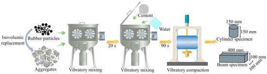 Due to the significant density difference between rubber and mineral aggregates, rubber particles tend to float to the surface of the mixture during mixing. Prepared by the vibration mixing method, rubber particles can be uniformly dispersed within the RCSM specimens. Therefore, all specimens were prepared using the vibration mixing method. The vibration compactor was set to a frequency of 30 Hz and an excitation force of 7.6 kN. The unconfined compressive strength tests for the mixture specimens before and after 7 days, 28 days, and freeze–thaw cycles were conducted using cylindrical specimens with a height and diameter of 150 mm each. Bending strength tests, bending modulus of resilience tests, fatigue tests, dry shrinkage tests, and temperature shrinkage tests were performed using beam specimens. Each specimen measures 400 mm in length, 100 mm in width, and 100 mm in height. The compaction time for cylindrical specimens was 90 s, while beam specimens required 120 s of vibration. Subsequently, the specimens were transferred to the standard curing room. The detailed preparation process is shown in Figure 5.