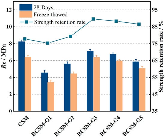 The freeze–thaw test results are provided in Figure 10. After five freeze–thaw cycles, the unconfined compressive strength of the mixtures decreased significantly. Meanwhile, the strength retention rate (the ratio of strength after to before freeze–thaw) indicates that, except for RCSM-G1, the strength retention of RCSM is superior to that of CSM. RCSM-G1 experienced the most severe frost swelling due to the large voids within the mixture.