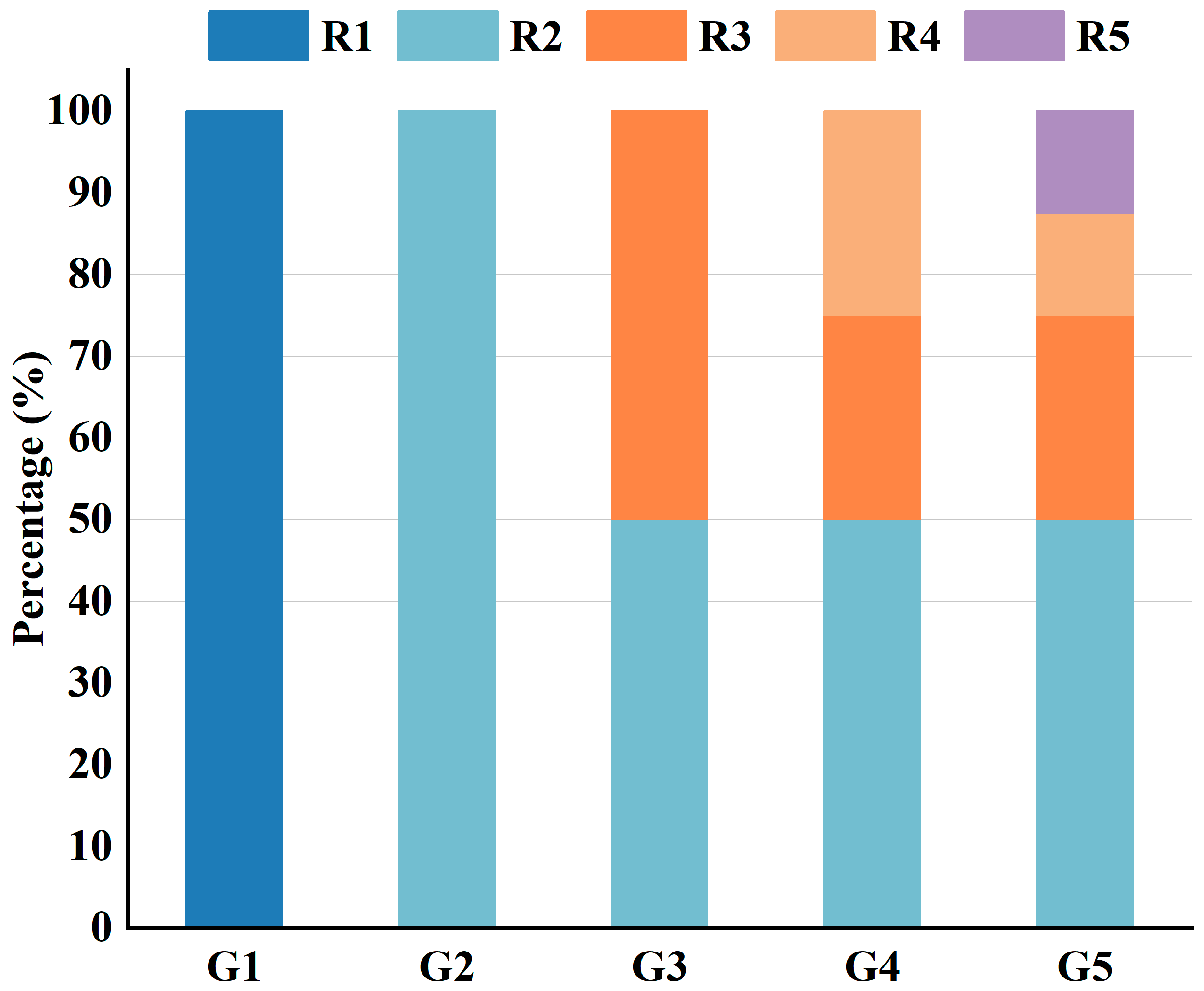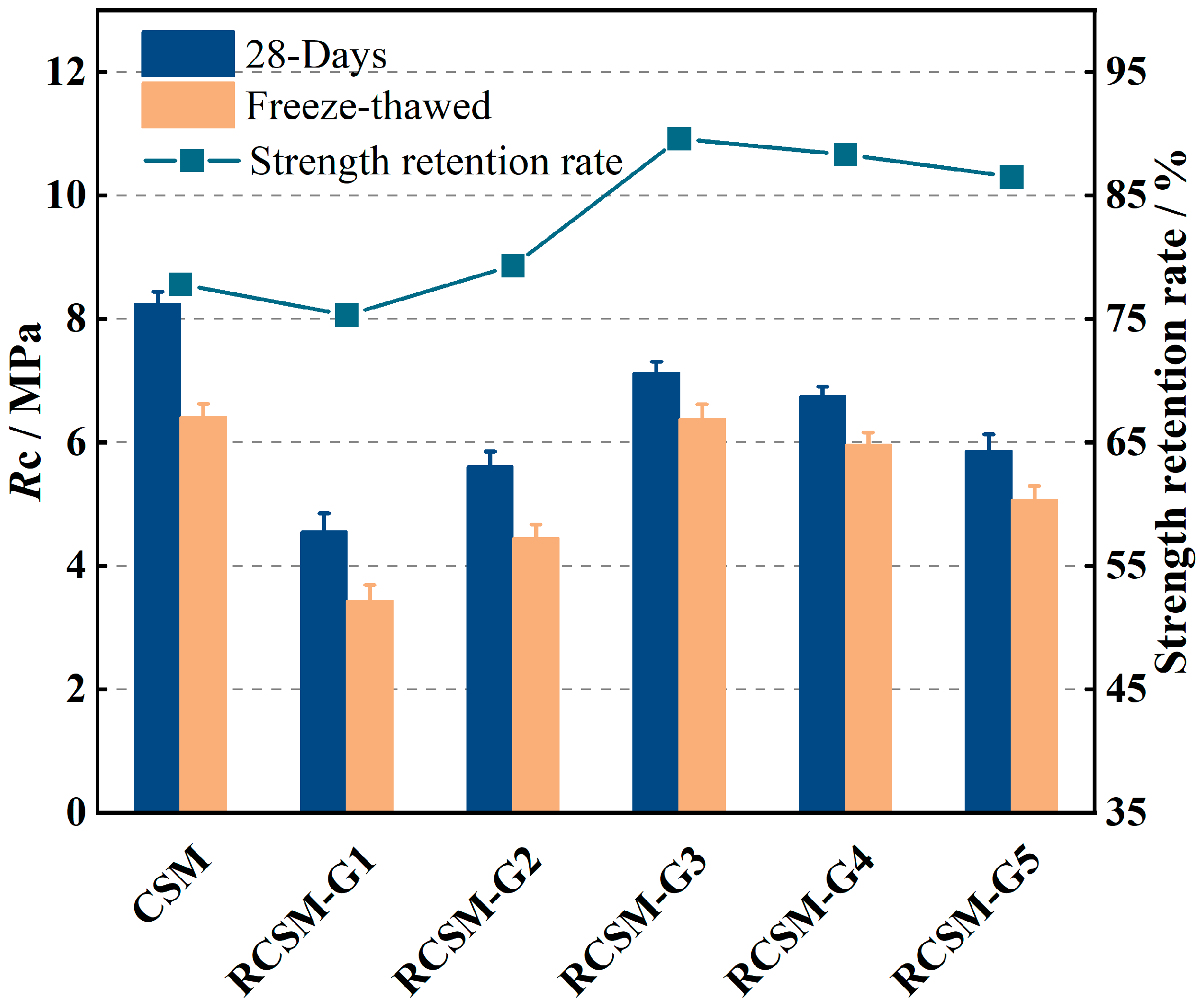 Figure 10. After five freeze–thaw cycles, the unconfined compressive strength of the mixtures decreased significantly. Meanwhile, the strength retention rate (the ratio of strength after to before freeze–thaw) indicates that, except for RCSM-G1, the strength retention of RCSM is superior to that of CSM. RCSM-G1 experienced the most severe frost swelling due to the large voids within the mixture.