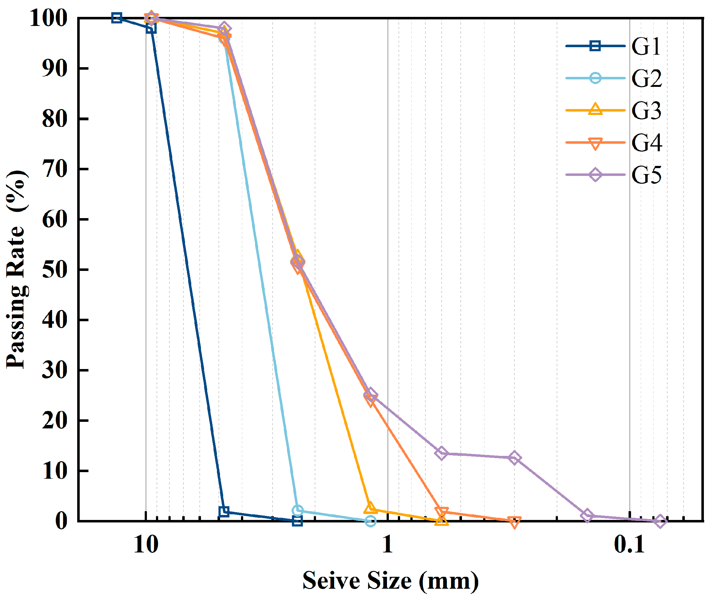 This study proposed an optimization method for rubber gradation. It addressed the inconsistency in gradation caused by unequal replacement particle sizes between rubber and aggregate. By optimizing rubber use in cement-based materials, the method enhances rubber utilization while improving the toughness and durability of cementitious materials. The main conclusions can be summarized as follows: