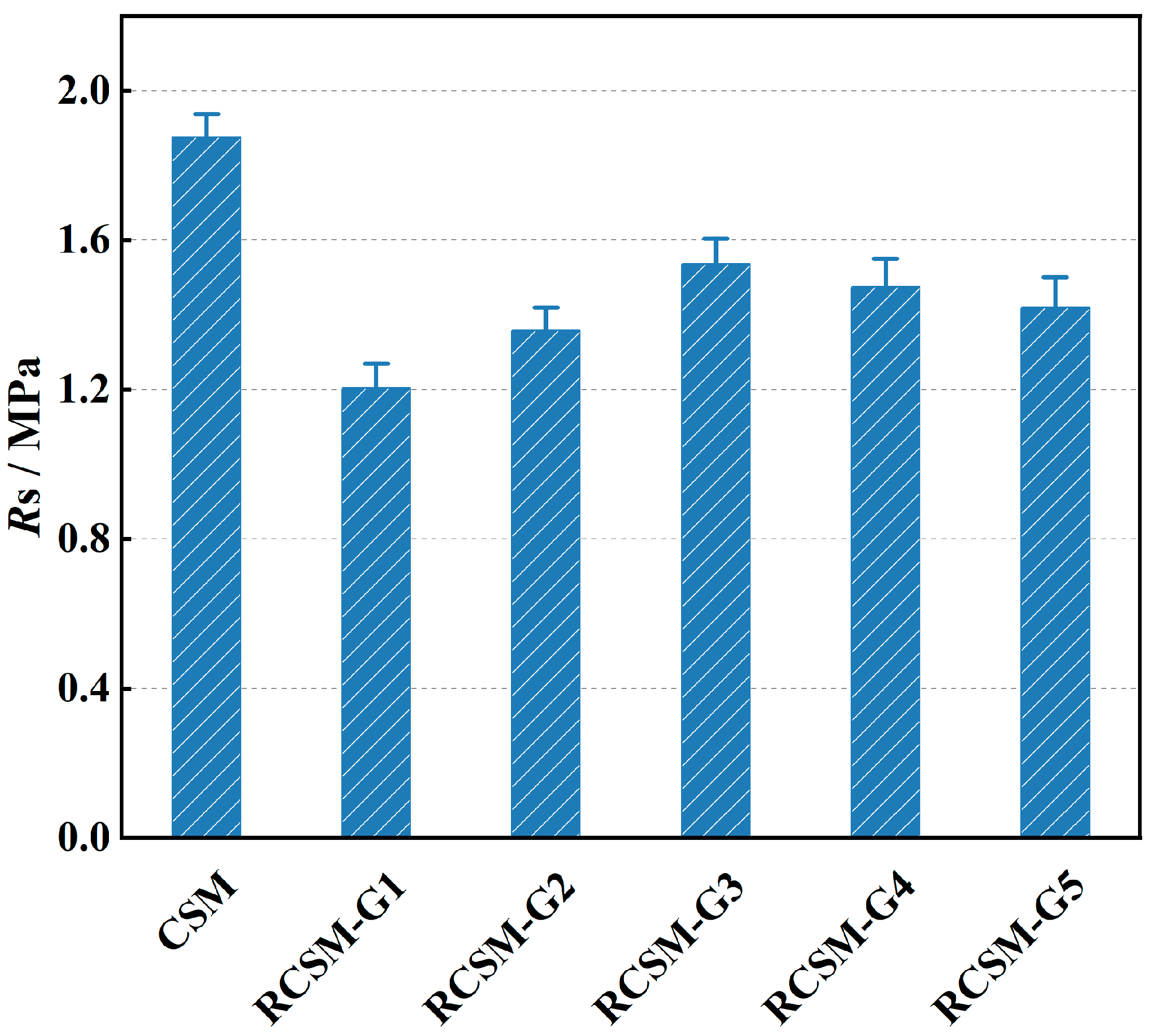 From RCSM-G1 to RCSM-G5, the compressive strength exhibited a hump-shaped trend, with the inflection point occurring at RCSM-G3. The 7-day and 28-day compressive strength of RCSM-G3 remained above 85% of regular CSM, indicating that the use of 1.18–4.75 mm rubber particles provided excellent strength retention. Furthermore, the strength retention of 1.18–2.36 mm rubber particles was superior to that of 2.36–4.75 mm particles, as demonstrated by the comparison between RCSM-G2 and RCSM-G3.