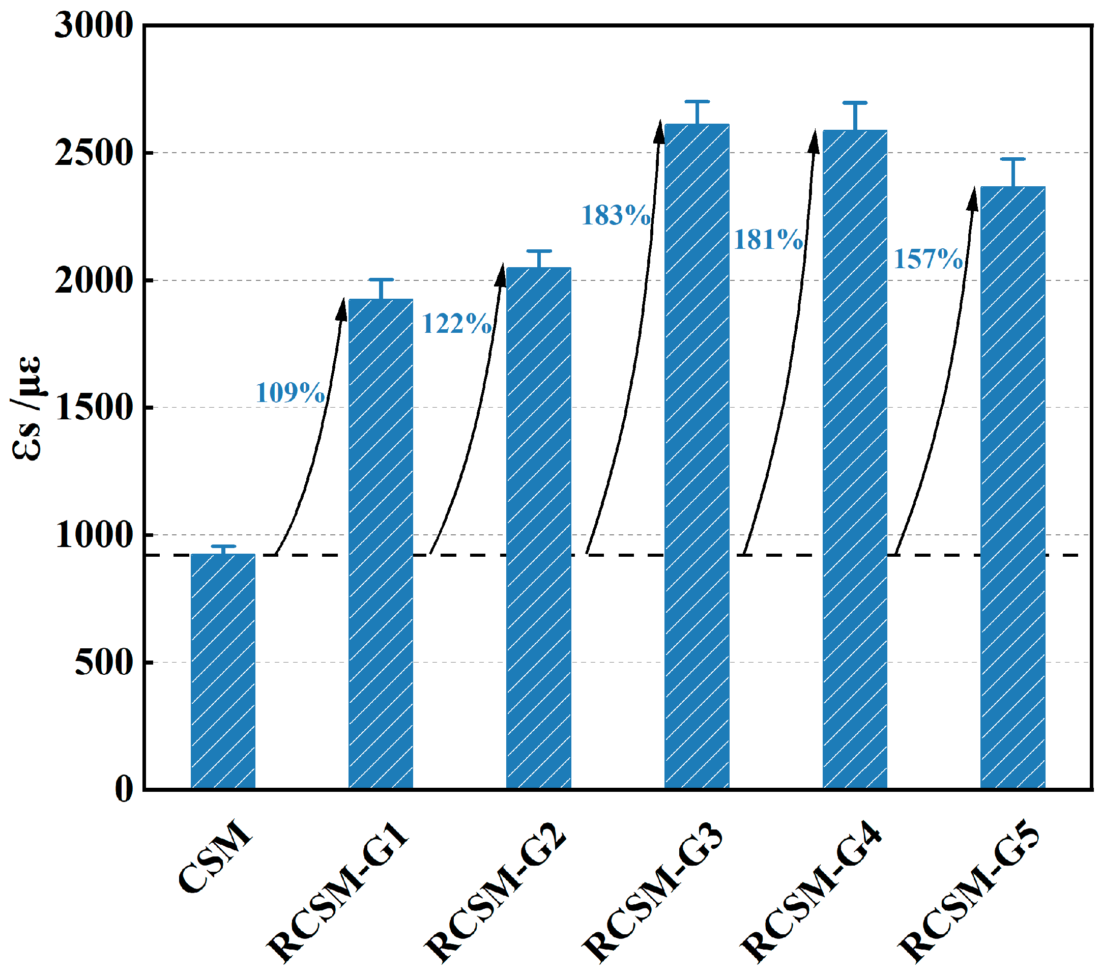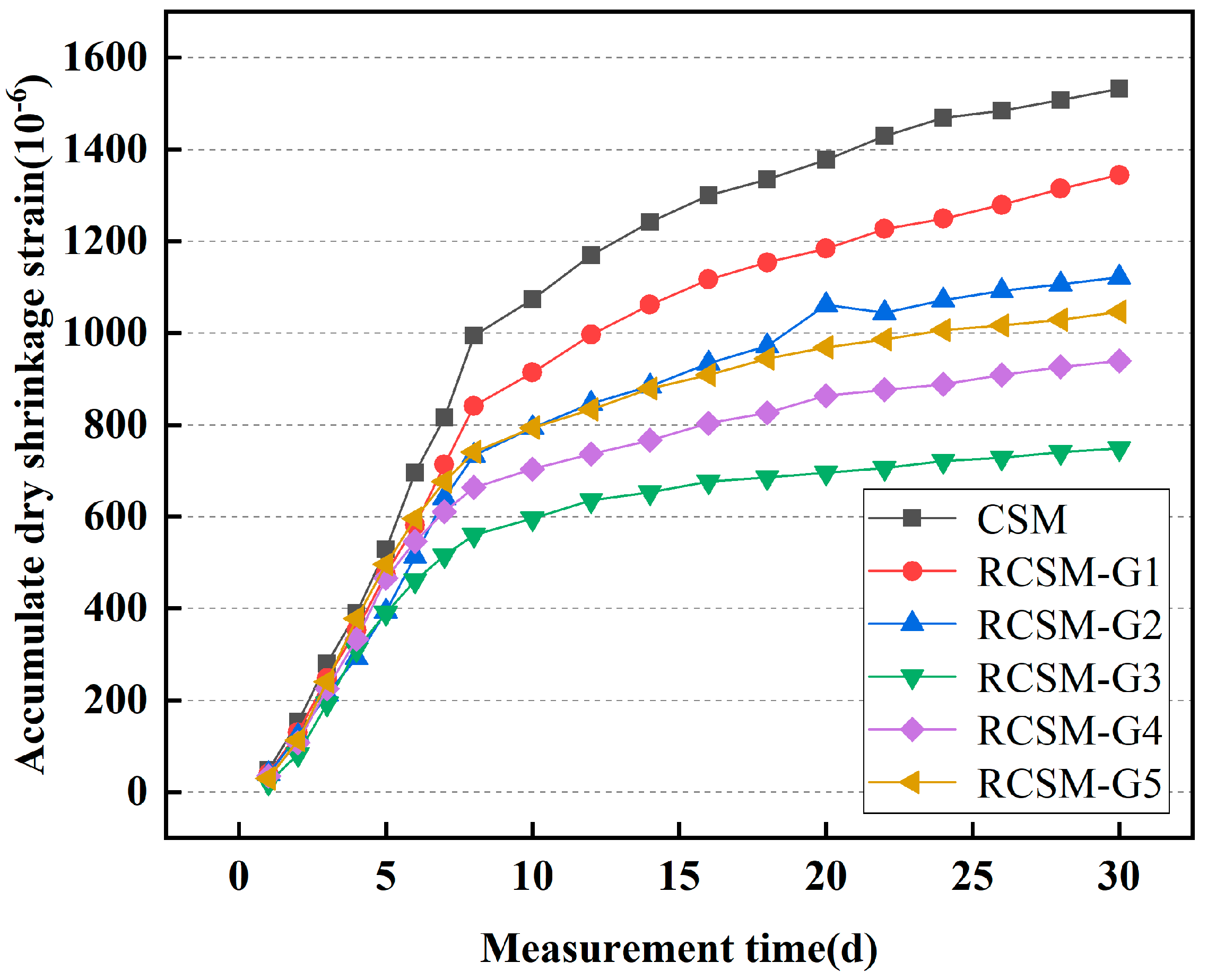 After 30 days of continuous drying, the cumulative dry shrinkage strain of CSM reached 1532.3 με. By contrast, the cumulative dry shrinkage strains of RCSM-G1 to RCSM-G5 were 1344.5 με, 1121.7 με, 748.6 με, 938.9 με, and 1046.6 με, respectively. The cumulative dry shrinkage strain of RCSM-G3 was reduced by 51% compared to CSM, indicating that the rubber particles effectively reduced the dry shrinkage strain in CSM.