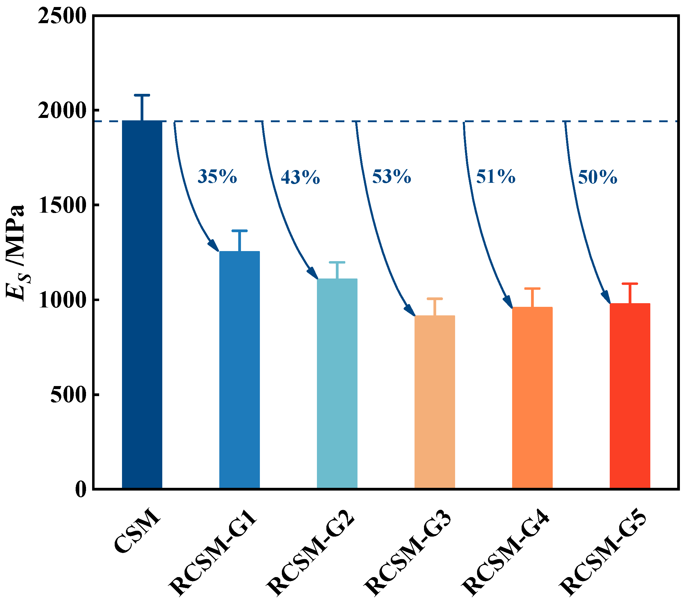 48], the modulus of the multi-phase material varies depending on the rubber composition and volume fraction. Therefore, the modulus of RCSM can be adjusted by controlling the rubber gradation. The moduli of RCSM-G1 and RCSM-G2 were approximately 64% and 57% of that of CSM, respectively, with a smaller reduction than RCSM-G3. The results suggest that the range of RCSM modulus adjustment with a single rubber particle size is considerably narrower than that of mixed rubber gradations. The modulus of CSM can be reduced by altering the gradation of rubber particles. Furthermore, rubber particles between 1.18 and 2.36 mm were found to be the most effective in relieving the stiffness of CSM among all the tested rubber particles.