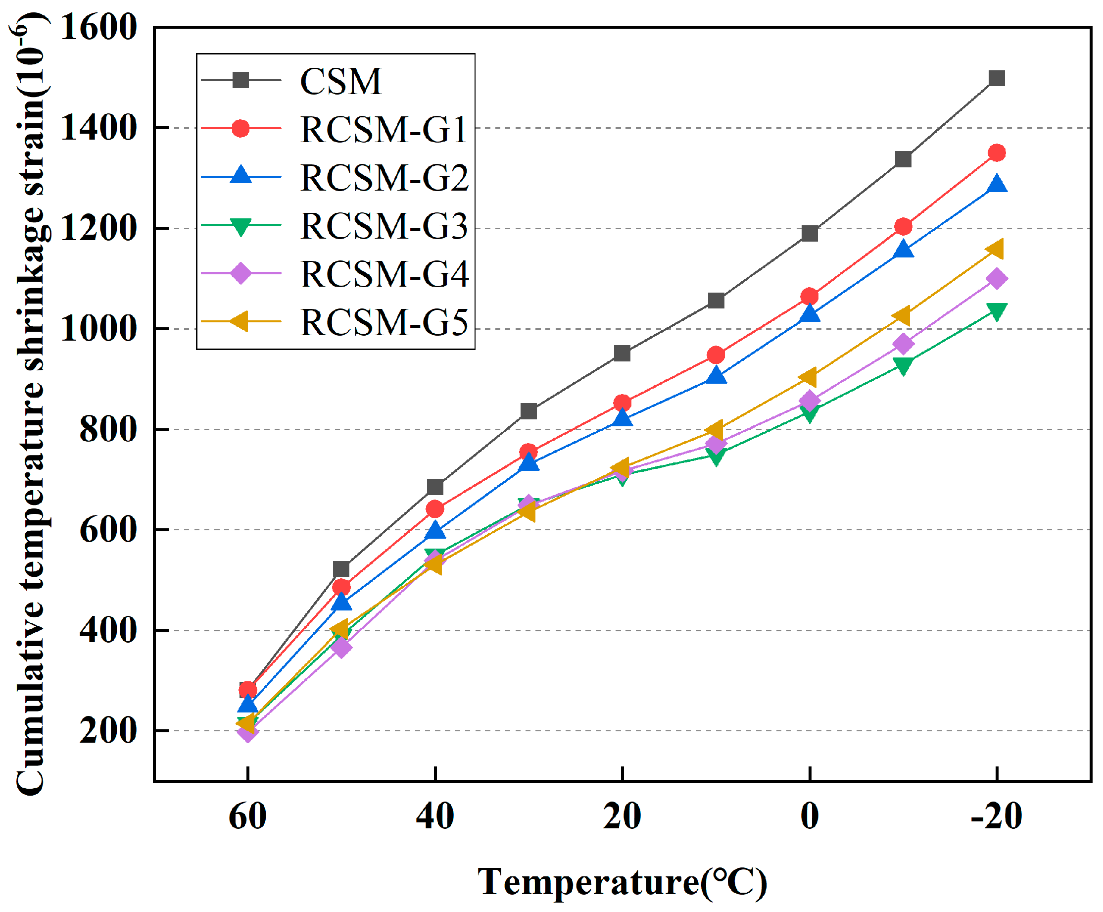 Figure 11, the cumulative temperature shrinkage strain increased as the temperature rose. Owing to their excellent deformability, rubber particles can effectively absorb the temperature-induced shrinkage stress in CSM. The cumulative strain of RCSM was notably lower than that of CSM, indicating that adding rubber particles reduced the temperature-induced shrinkage deformation in semi-rigid subgrade materials. Consequently, the anti-cracking performance of the semi-rigid subgrade was markedly improved.