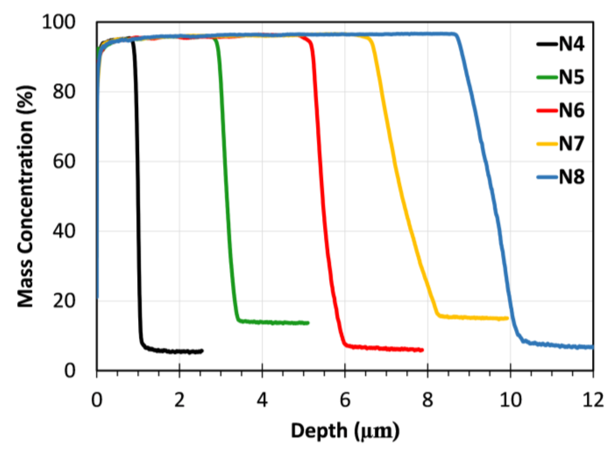 Depth profile analyses of Ni-coated SS samples at different voltages (4 to 8 V) are shown in Figure 1. As expected, increasing the applied voltage increased coating thickness due to the stronger electric field, which accelerated ion transport, leading to thicker coatings in a short time. The thinnest Ni coating was observed for the N4 sample (Ni coating on SS sample using 4 V over 30 min) with a thickness of approximately 1.5 μm. With increasing voltage, the coating thickness increased progressively to ~3.2 μm for N5 (Ni coating on SS sample using 5 V over 30 min), ~5.5 μm for N6 (Ni coating on SS sample using 6 V over 30 min), ~7.7 μm for N7 (Ni coating on SS sample using 7 V over 30 min), and reached its maximum value of ~10.5 μm for N8 (Ni coating on SS sample using 8 V over 30 min). Notably, the Ni concentration remains close to 100% throughout the coating thickness in all samples, indicating uniform deposition. The sharp drop at the interface indicates minimal interdiffusion between the Ni layer and the SS.