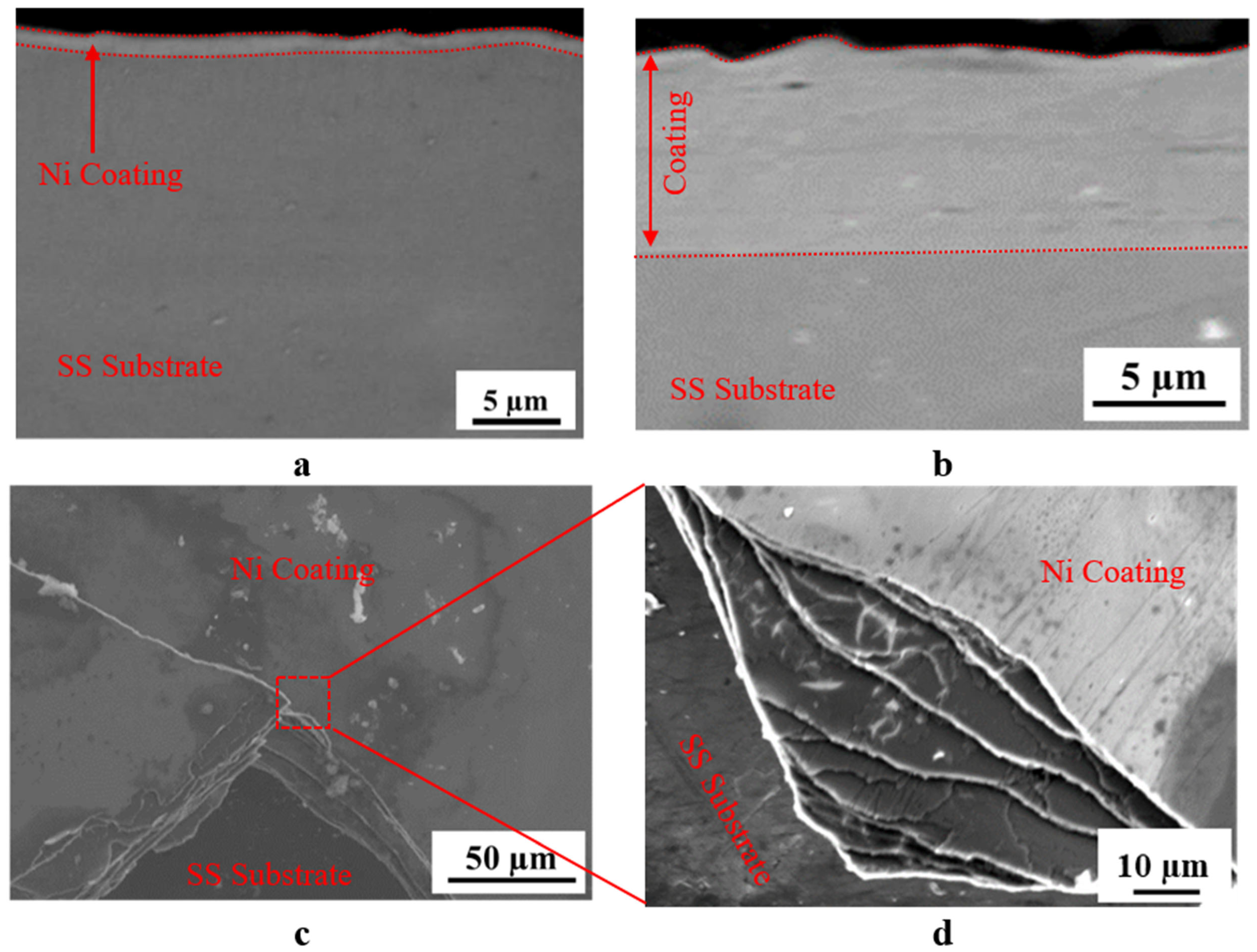 The cross-sectional SEM images of the N4 (Figure 2a) and N6 samples reveal a uniform Ni coating with good adhesion to the stainless steel, indicating high-quality deposition (Figure 2b). Although the coating thickness varied with voltage, the coating quality (adhesion and no degradation) of N5 is similar to that of N4 and N6. On the other hand, for the N7 and N8 samples, the coating at the edges was degraded during brushing, indicating that coating quality decreased at high voltages, as shown in Figure 2c,d. The fractured coating layer was further investigated by SEM at high magnification (Figure 2d), revealing that the Ni coatings grew in a layer-by-layer structure. As is known, the carbon electrode wrapped in cotton is dipped into the plating solution every 10 s. It carries the plating on, meaning the process is a 10-s deposition repeated over 30 min. With each brushing, a nanosized coating layer is deposited on the sample surface, forming a multilayered structure as it accumulates and continues to grow as plating proceeds.