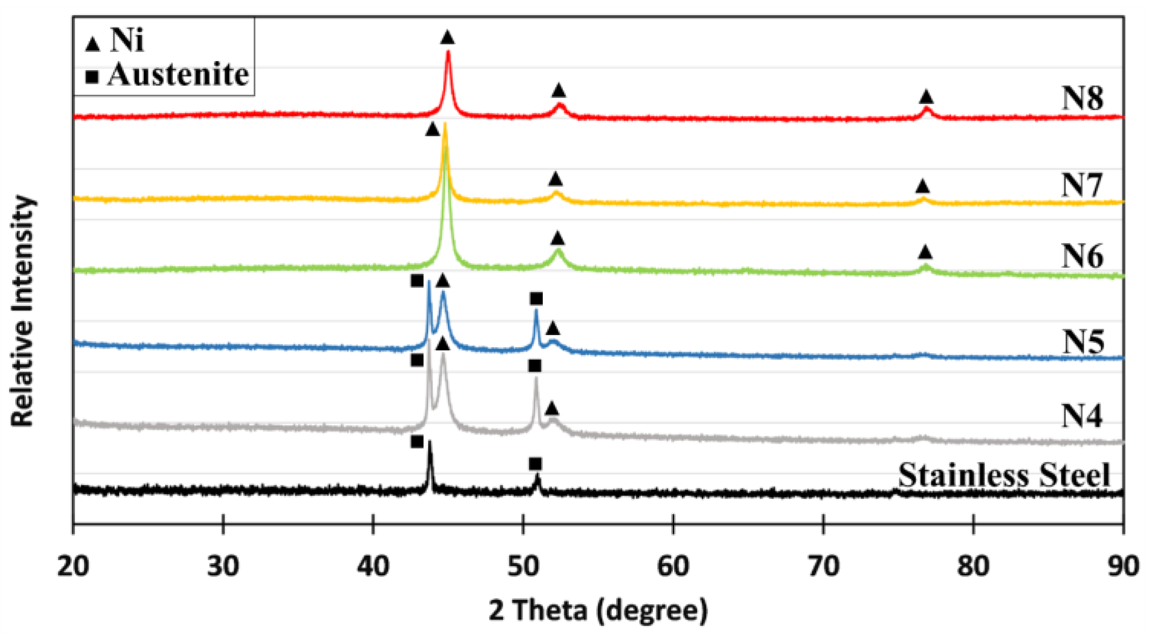 XRD patterns of the Ni coatings deposited at lower plating voltages (samples N4 and N5 in Figure 3), where the coating thickness was less than 3 µm, exhibited crystallographic reflections corresponding to the face-centred cubic (FCC) Ni phase. Additionally, peaks associated with the austenitic SS were observed, indicating that X-rays penetrated the SS via the Ni layer. In contrast, no austenite-related peaks were detected for coatings deposited at higher voltages (samples N6, N7, and N8), suggesting that the thicker Ni layer prevented X-ray penetration to the stainless steel.