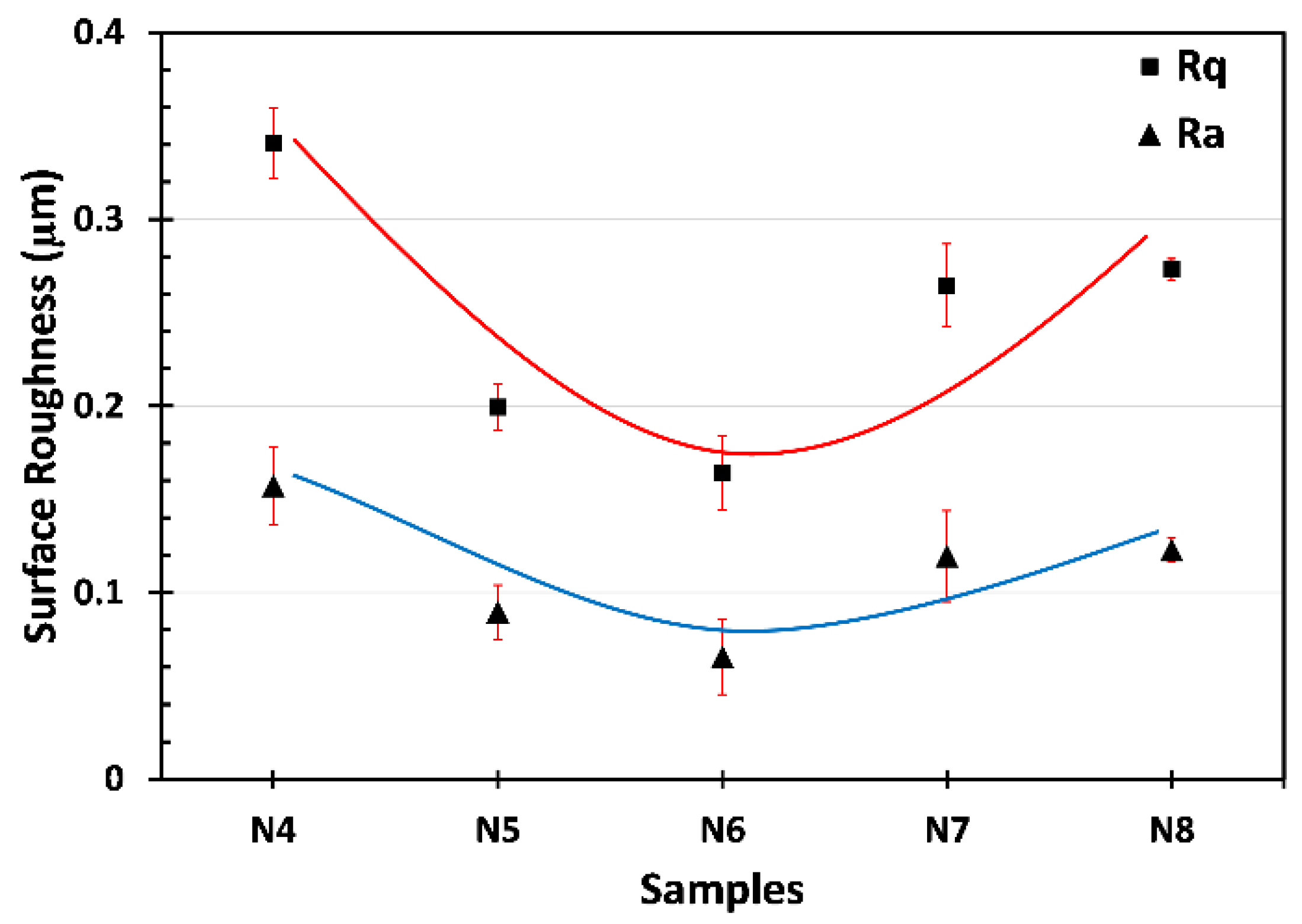 Average roughness (Ra) and root mean square roughness (Rq) were measured for each sample, and the results are given in Figure 4. The lowest surface roughness was observed for sample N6 with Ra ≈ 0.7 μm and Rq ≈ 0.17, whereas the highest surface roughness was measured for sample N4 with Ra ≈ 1.6 μm and Rq ≈ 0.34 μm. The lower deposition rate at lower voltages resulted in larger, irregular Ni grains, thereby increasing surface roughness. On the other hand, the adhesion of rapidly nucleating Ni particles to the SS does not occur at the desired quality at high deposition rates, which causes partial peeling and increases the surface roughness as seen in N7 and N8 samples in Figure 4. Additionally, high-rate deposition increases the internal stress within the coating, leading to degraded coating and a rougher surface.