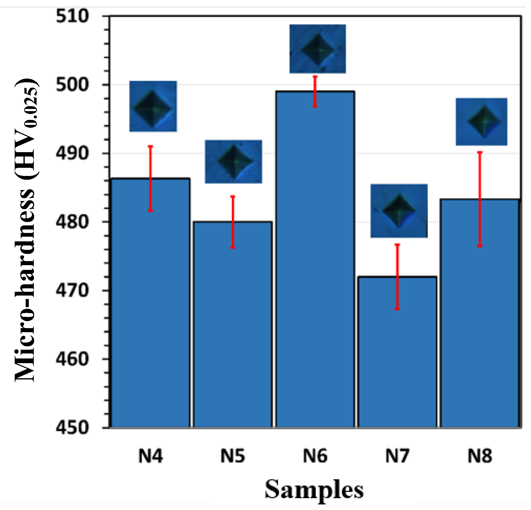 The hardness for the Ni-coated samples (N4 to N8 in Figure 5) demonstrated significant variation with the applied voltage during electro-brush plating. Sample N6 exhibited the highest hardness at HV0.025 498, with minimal variation. At the same time, the lowest value was obtained for the N7 sample at around HV0.025 472, indicating that a plating voltage of 6 V is optimal for producing a layer with higher hardness, likely due to a fine-grain structure, and for improving the uniformity of the coating.